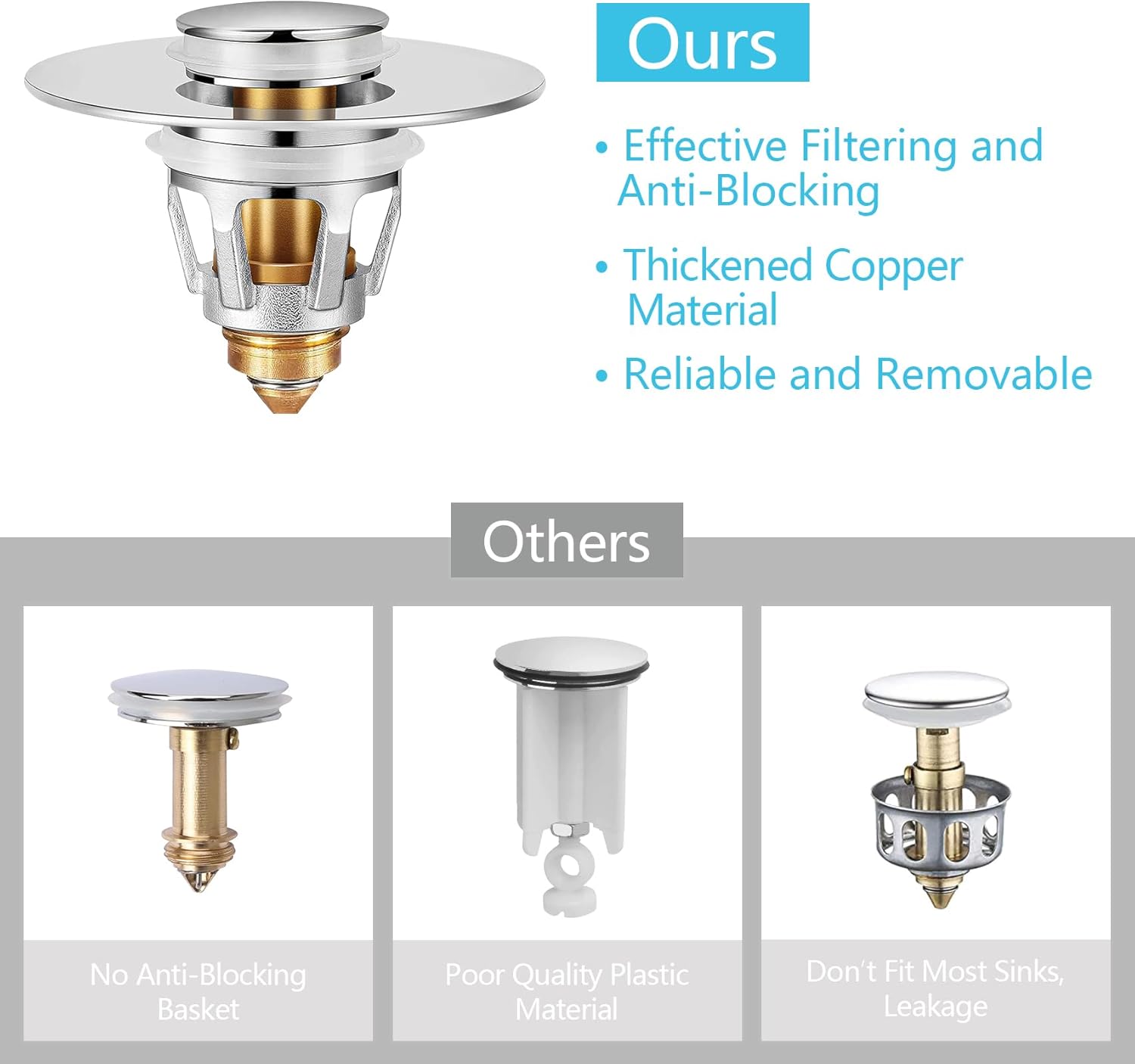 - [ with Hair Catcher ] The drain plug with an anti-blocking basket strainer inside which can collect hairs and prevent the drain from clogging up, achieving effective filtering, unlike regular push button drain.