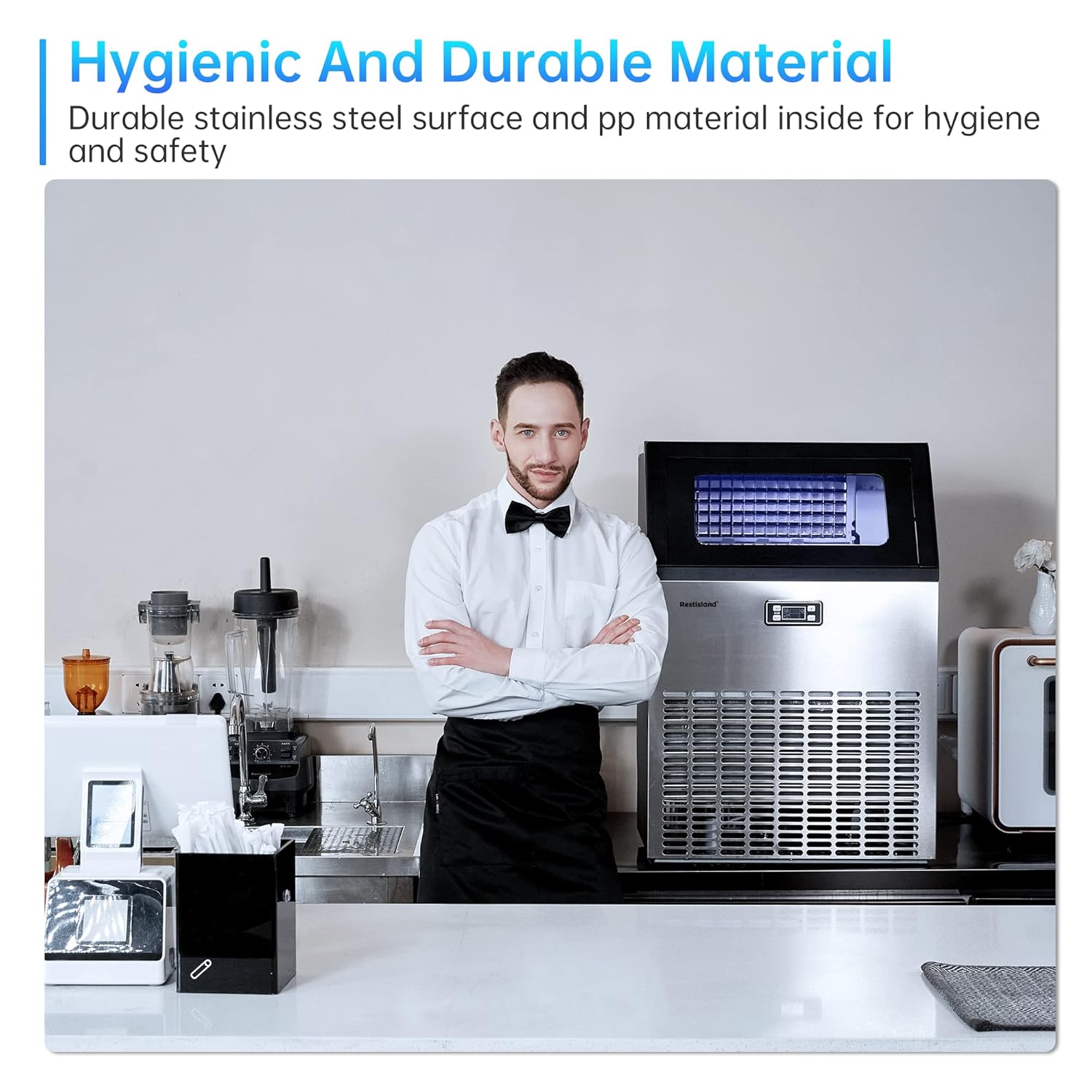 Commercial Ice Maker Machine, 200 lbs/24 Hours, 48 lbs Storage Bin, Stainless Steel, Blue Light, Freestanding, Great for Home or Business, Includes Ice Scoop, Connecting Hose