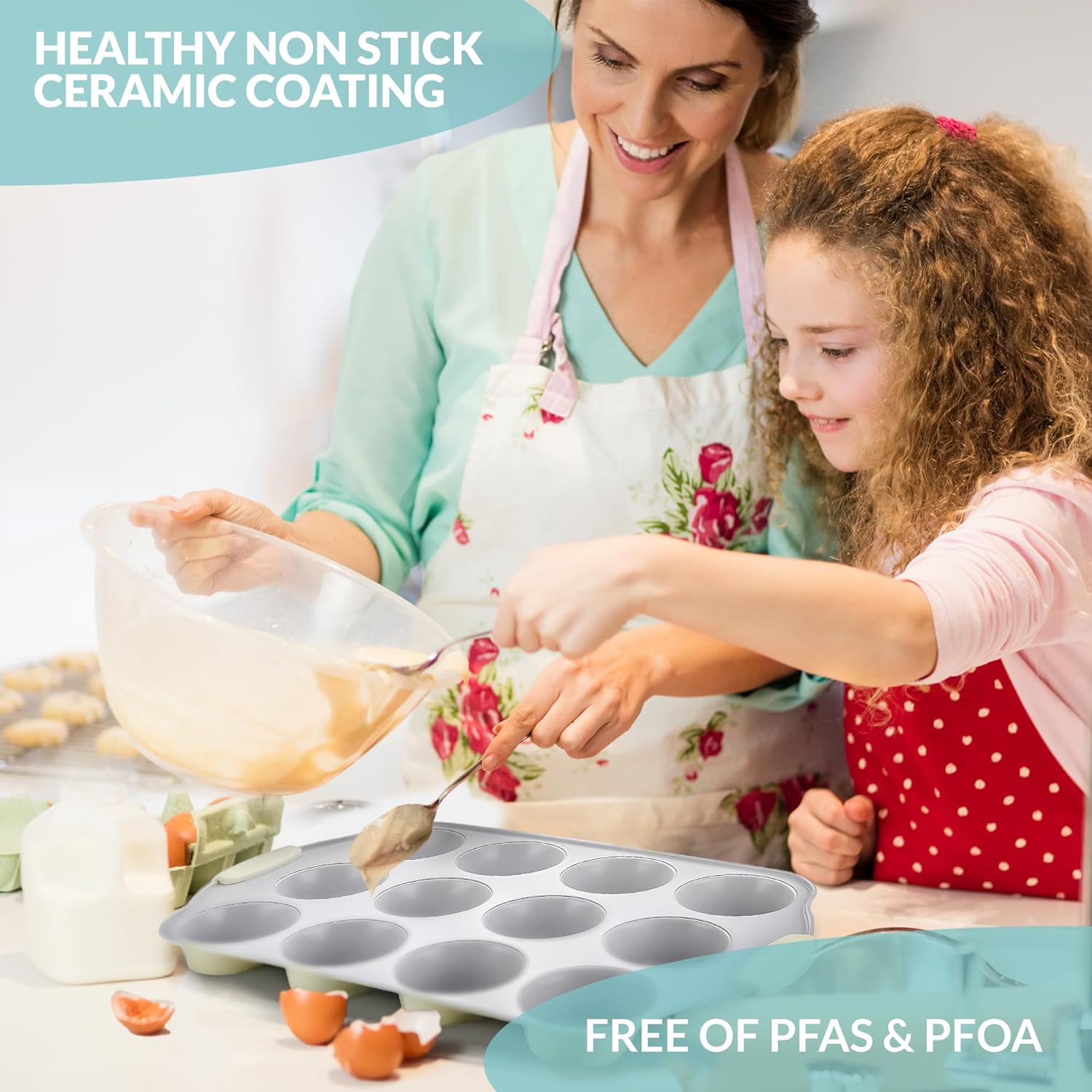 - EASY RELEASE: No spraying required; there's nothing worse than having to dig out and crumble those perfect muffins; the easy release, high quality, food-safe PFOA & PTFE-Free nonstick coating of this large muffin pan ensures effortless quick and easy cupcake and muffin release.