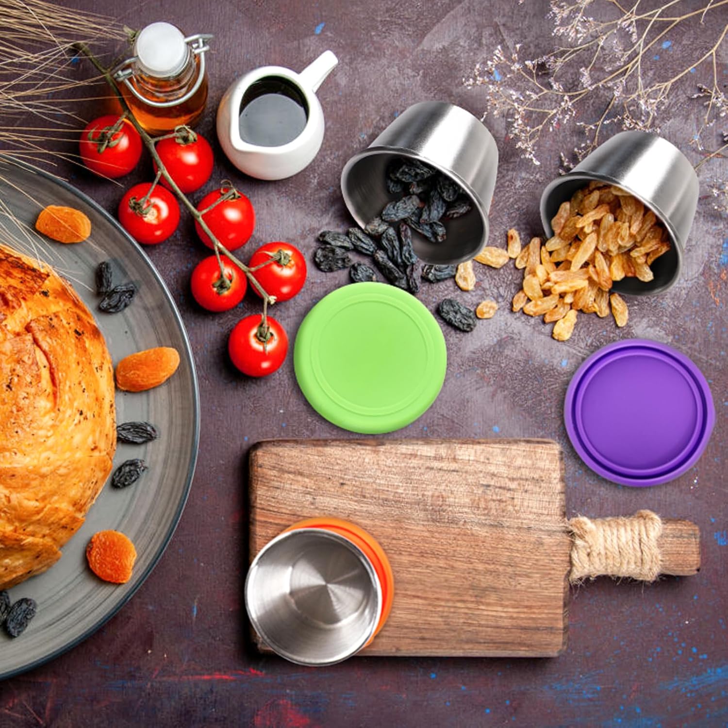- 6 Colors Silicone Lids: The combination of the soft silicone lid and the handle is very easy to open. The cute rainbow color lid not only can be used to distinguish the different sauces in the container but also to make it easy to keep things separated and organized. The 6 piece set can meet your small-capacity and multi-variety needs.