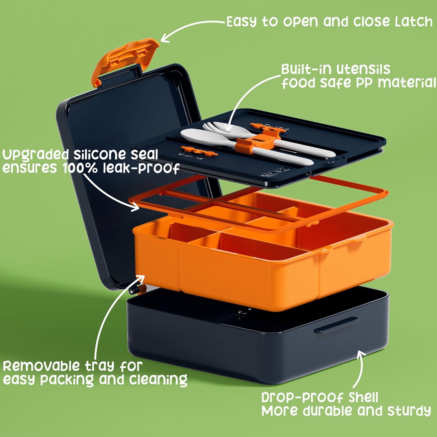 - 100% LEAKPROOF BENTO LUNCH BOX: Fimibuke lunch box (41oz/1300ml capacity) is designed with 4 individual compartments, accommodating larger items like whole sandwiches, pasta, fruits, veggies, salad or dessert. With airtight lid, Fimibuke kid lunch box is 100% leak-proof and foods will still stay in its original compartment and will not leak into each other. Removable lid & tray, utensils and sauce jar are top rack dishwasher safe ( under 80℃) & freezer safe, and its food tray is microwave safe
