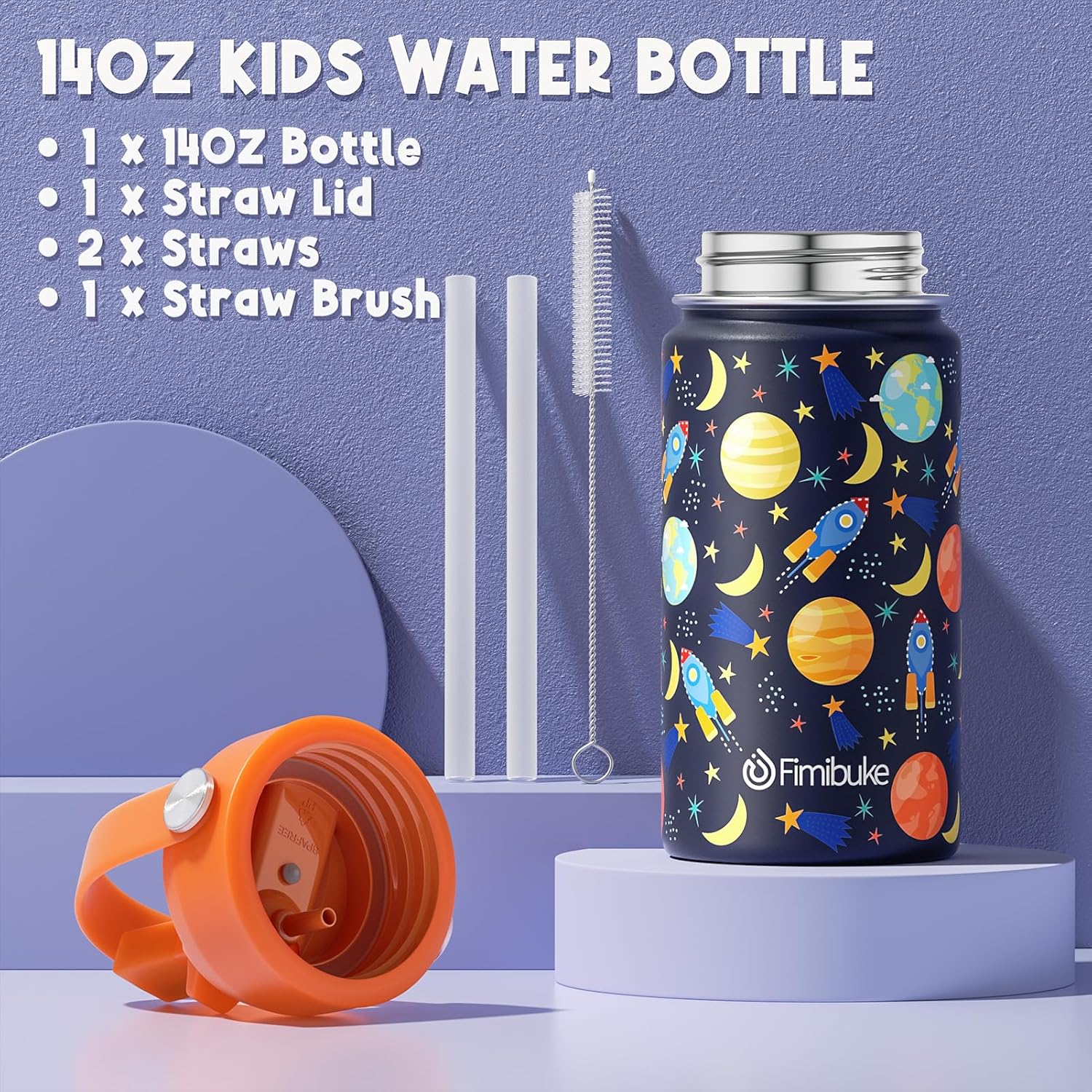- 14OZ KIDS INSULATED WATER BOTTLE: With double-walled vacuum insulation, these toddler water bottle can preserve beverage temperature up to 24 hours for cold and 12 hours for hot. The seal zone technology in the lids guarantees that each insulated water bottle is 100% leak-proof and spill-proof. Fimibuke sweat-free kids water bottle features a sturdy wide rotating handle, allowing to carry kids drinks around to keep them hydrated without making messes. All designed to keep kids beverage fresh