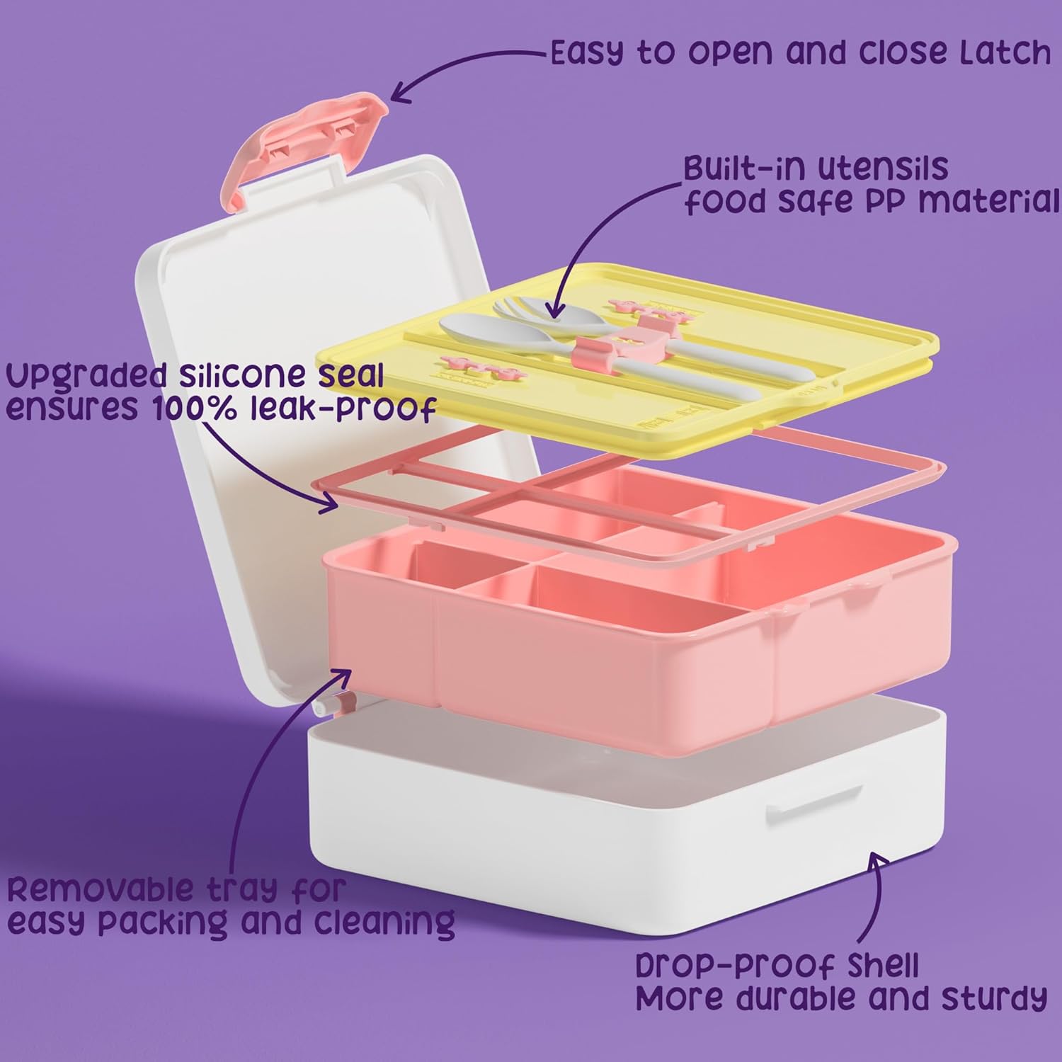 - 100% LEAKPROOF BENTO LUNCH BOX: Fimibuke lunch box (41oz/1300ml capacity) is designed with 4 individual compartments, accommodating larger items like whole sandwiches, pasta, fruits, veggies, salad or dessert. With airtight lid, Fimibuke kid lunch box is 100% leak-proof and foods will still stay in its original compartment and will not leak into each other. Removable lid & tray, utensils and sauce jar are top rack dishwasher safe ( under 80℃) & freezer safe, and its food tray is microwave safe
