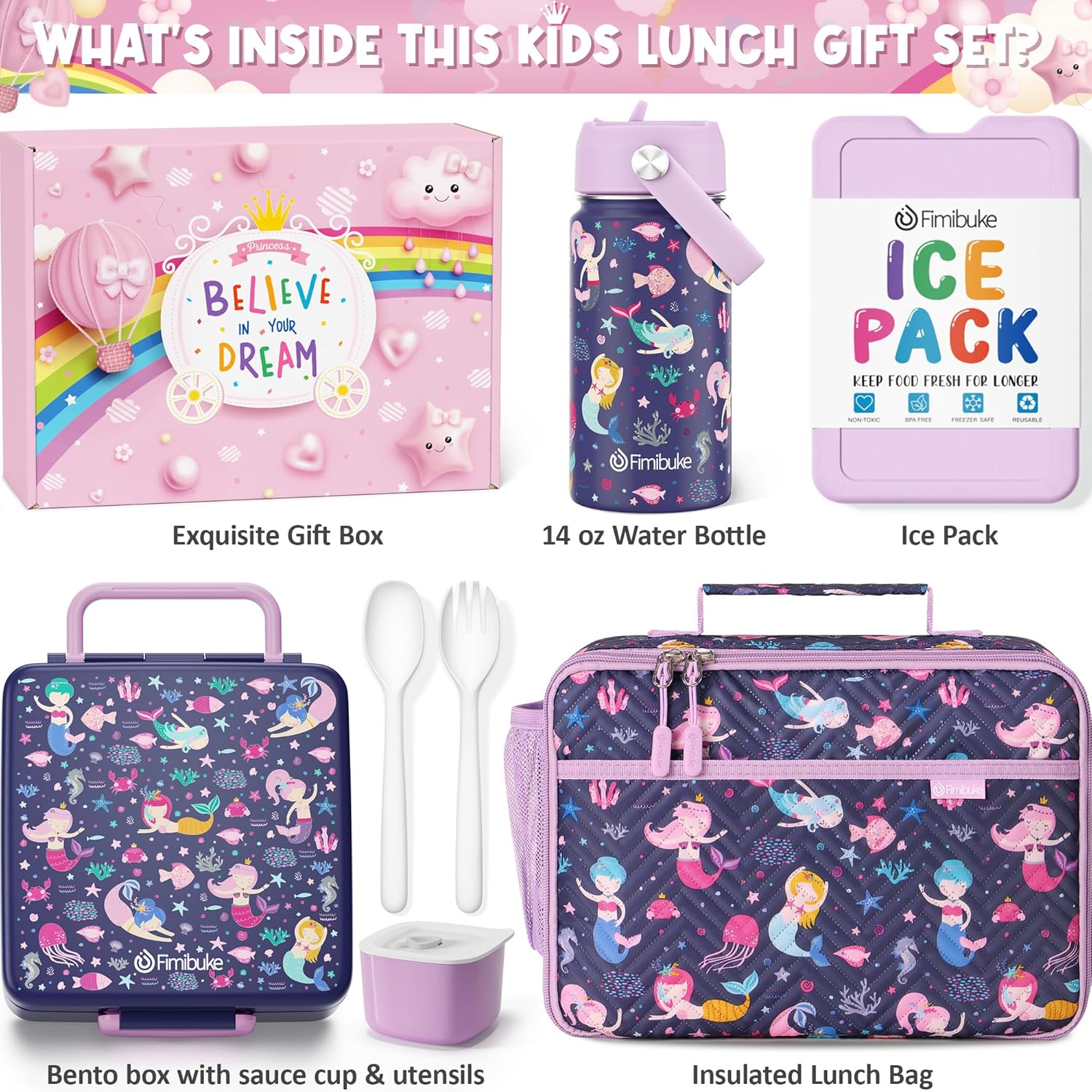 - 7PCS KIDS SCHOOL LUNCH BOX GIFT SET: Fimibuke kids lunch box set provides an one-stop solution for kids school lunch or snacks packing and carrying, this all combined gifts box comes with a 100% leak-proof bento box, a 14oz water bottle insulated, a kids insulated lunch bag, an ice pack, a sauce jar, a set of utensils and an exquisite gift box. Perfect for ages 3-12 kids to daycare, nursery school, preschool, kindergarten, elementary school, back to school or summer camp with a healthy lunch