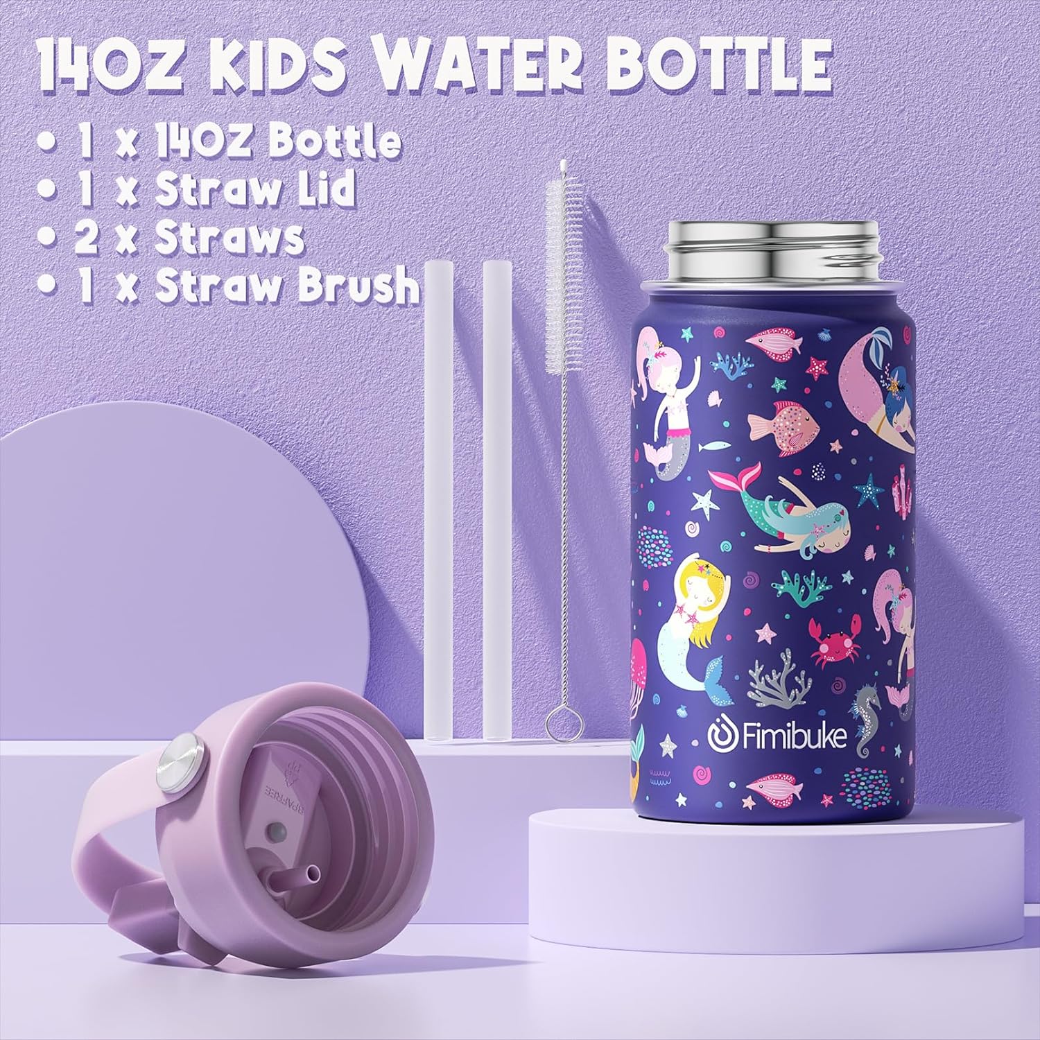 - 14OZ KIDS INSULATED WATER BOTTLE: With double-walled vacuum insulation, these toddler water bottle can preserve beverage temperature up to 24 hours for cold and 12 hours for hot. The seal zone technology in the lids guarantees that each insulated water bottle is 100% leak-proof and spill-proof. Fimibuke sweat-free kids water bottle features a sturdy wide rotating handle, allowing to carry kids drinks around to keep them hydrated without making messes. All designed to keep kids beverage fresh
