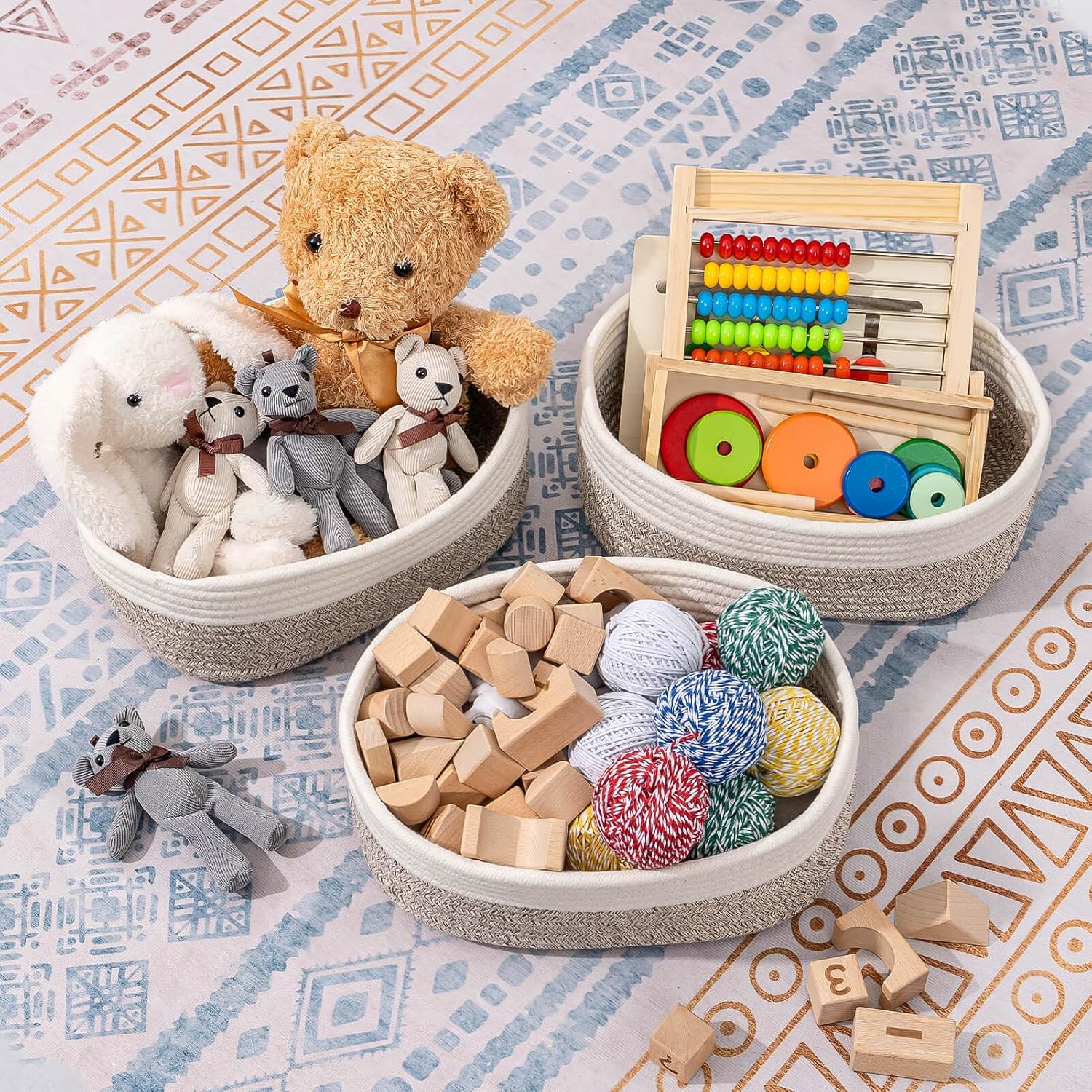 - Classy Natural Cotton Rope Storage Baskets-High quality well made. Very sturdy and a cute modern style. Durable woven rope, Long-lasting, skin-friendly, soft and attractive. You need these adorable baskets to put some supplies in, diaper, jewelry, cosmetics, makeup brushes, tea bags, storing smaller toys, toddler socks, candy