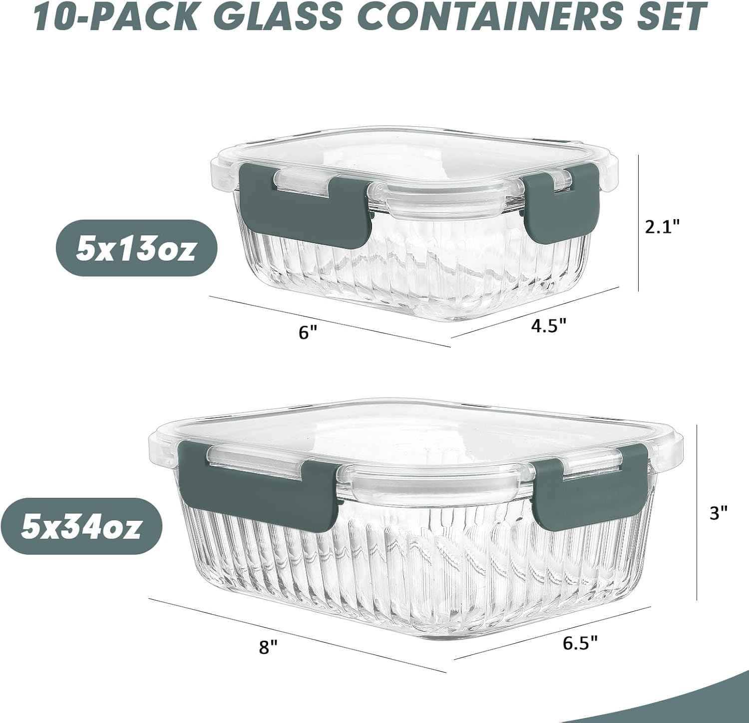 - VERSATILE MEAL PREP CONTAINERS SET: This10-pack set includes 5 large 34 oz and 5 small 13 oz glass meal prep containers with lids, perfect for meal prepping, portion control, and storing leftovers. Ideal for packing lunches, snacks, and ingredients.