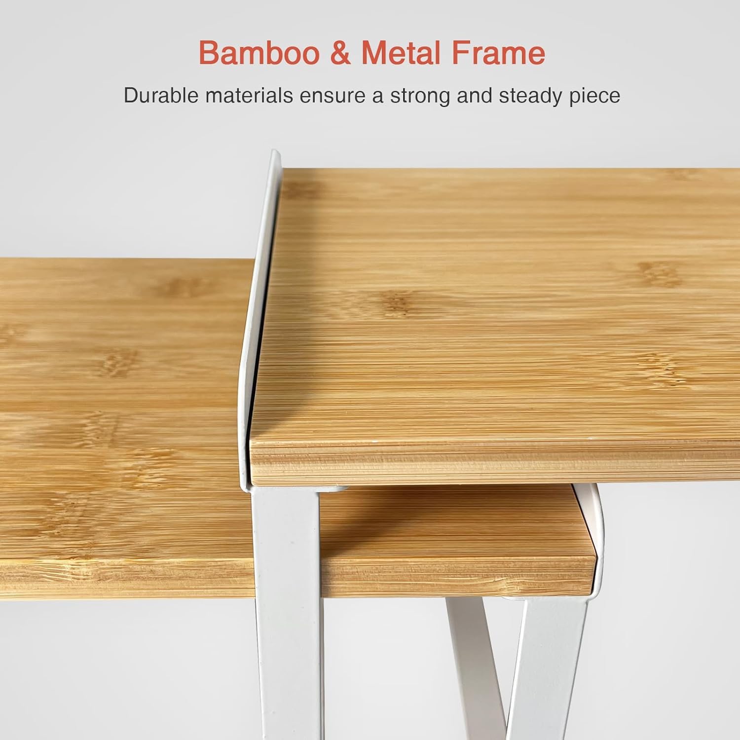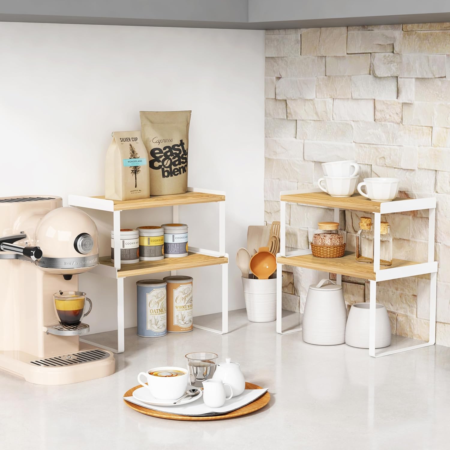 Kitchen Cabinet Organizer Set of 4, Desk Shelf Riser, Stackable Cabinet Pantry Cupboard Organizer, Kitchen Counter top Shelf, Storage Rack for Spices, Plates, Bamboo Wood, White