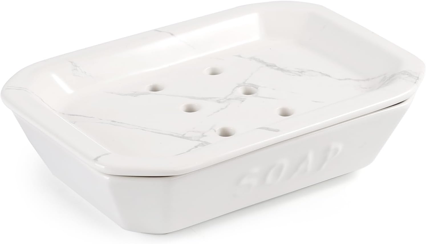 - 【Dual-layer design】The ceramic soap dish upper layer has holes that allow the soap to drain the excess water that remains on it after being used. The soap holder bottom layer holds the excess water to avoid unwanted spillage on other surfaces, keep the surface dry.