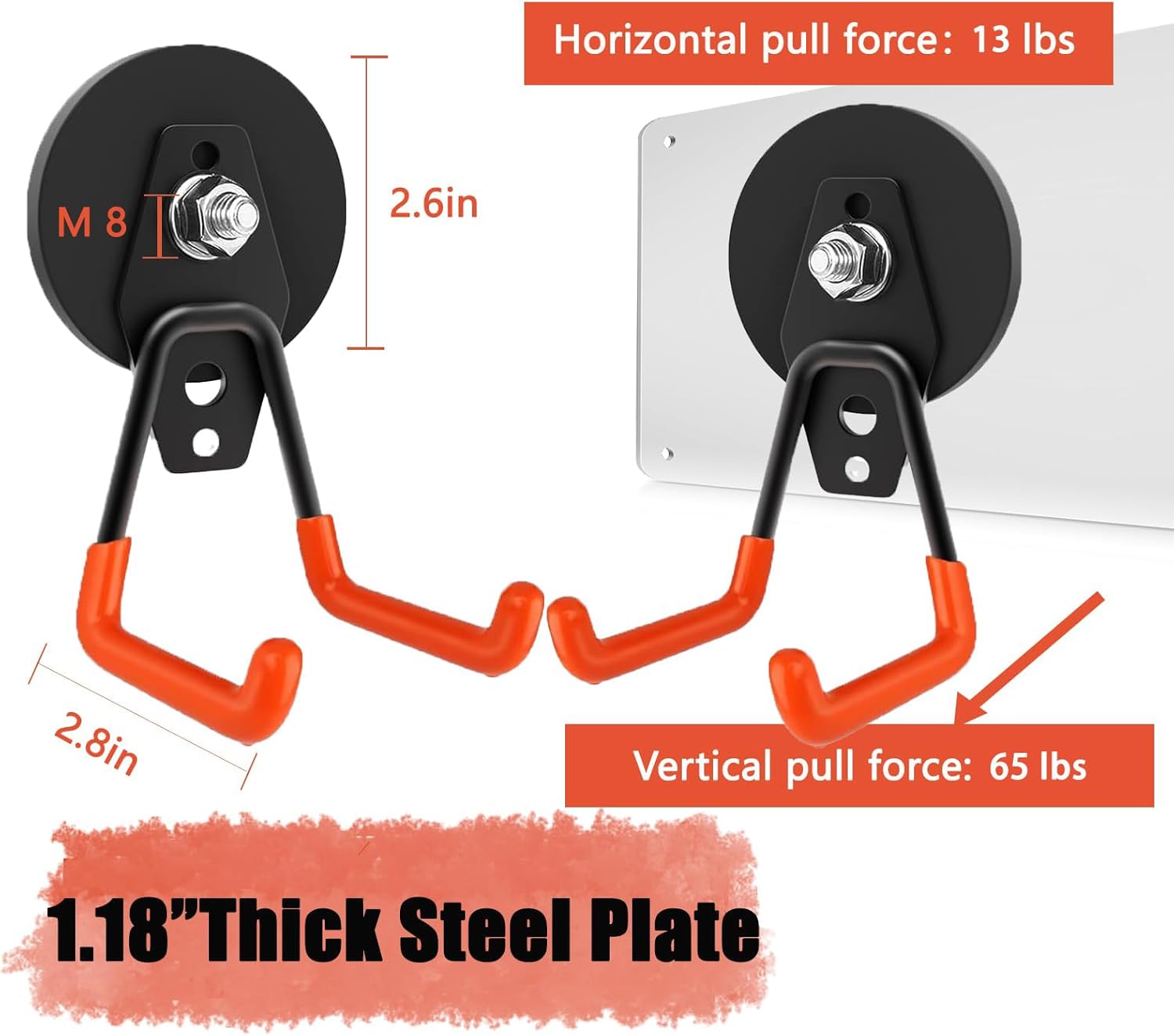 - 🧲[Large Storage Magnetic Hooks]:These magnetic hooks includes 4 (2.6inch) strong magnet base with threaded bar, spacers,nuts and 4 PVC coated medium L hooks. We tested that our medium L magnetic hook can hold any kind of EV charger,more than one gallon bottled water, any kind of garage tool,drill, toolbox etc.