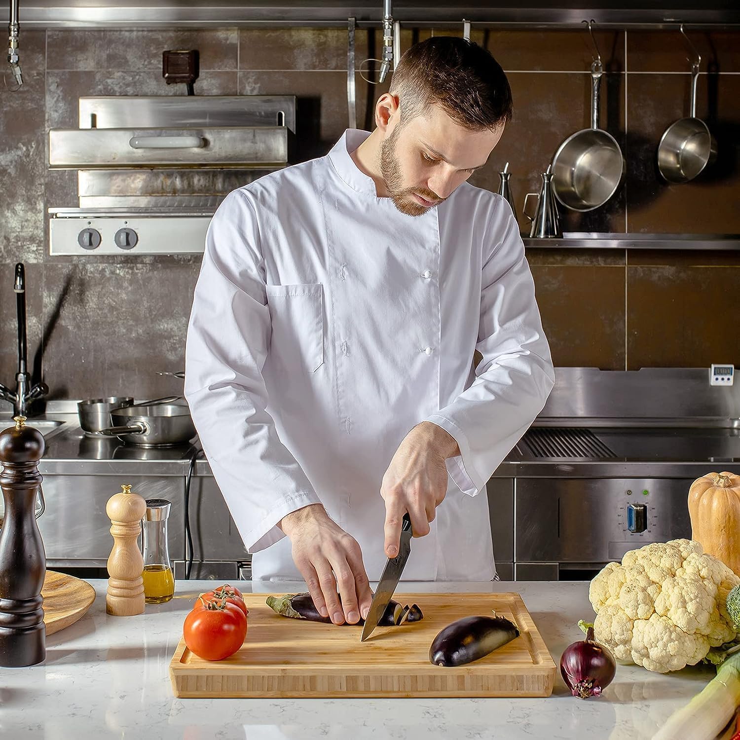 - Ergonomic Handle: In order to make it more professional, the chef knife handle is made of unique blue pakkawood, and the ergonomic handle and blade to achieve proper balance, minimize fatigue, numbness in the fingers, and pain after long hours of continuous gripping, and easily completing various kitchen cutting tasks