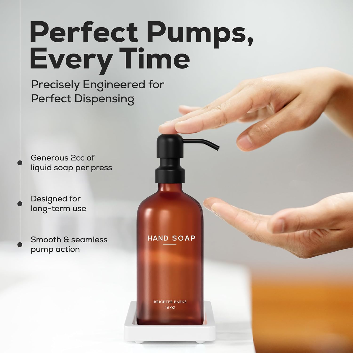- AMERICAN DESIGN, UNCOMPROMISING QUALITY - Crafted with meticulous attention to detail, our amber glass soap dispenser set features 2 robust 16oz glass bottles, corrosion-proof 304G stainless steel pumps, and a stain-resistant ceramic tray. All designed in the USA to provide unbeatable quality and enduring style that you can trust.
