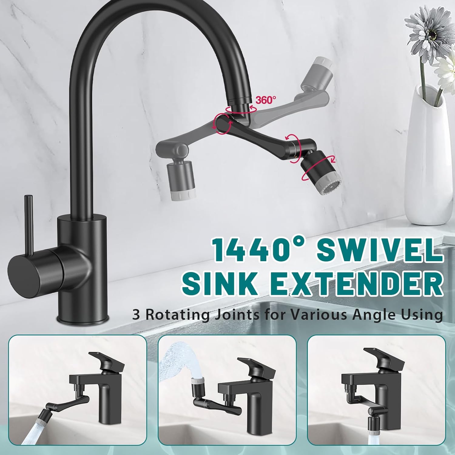CECEFIN 1440° Rotating-Faucet-Extender Sink Aerator - 1080°+360° Large-Angle Splash Tap Extension with 2 Water Outlet, Swivel Multifunctional Robotic Arm for Kitchen/Bathroom, Black