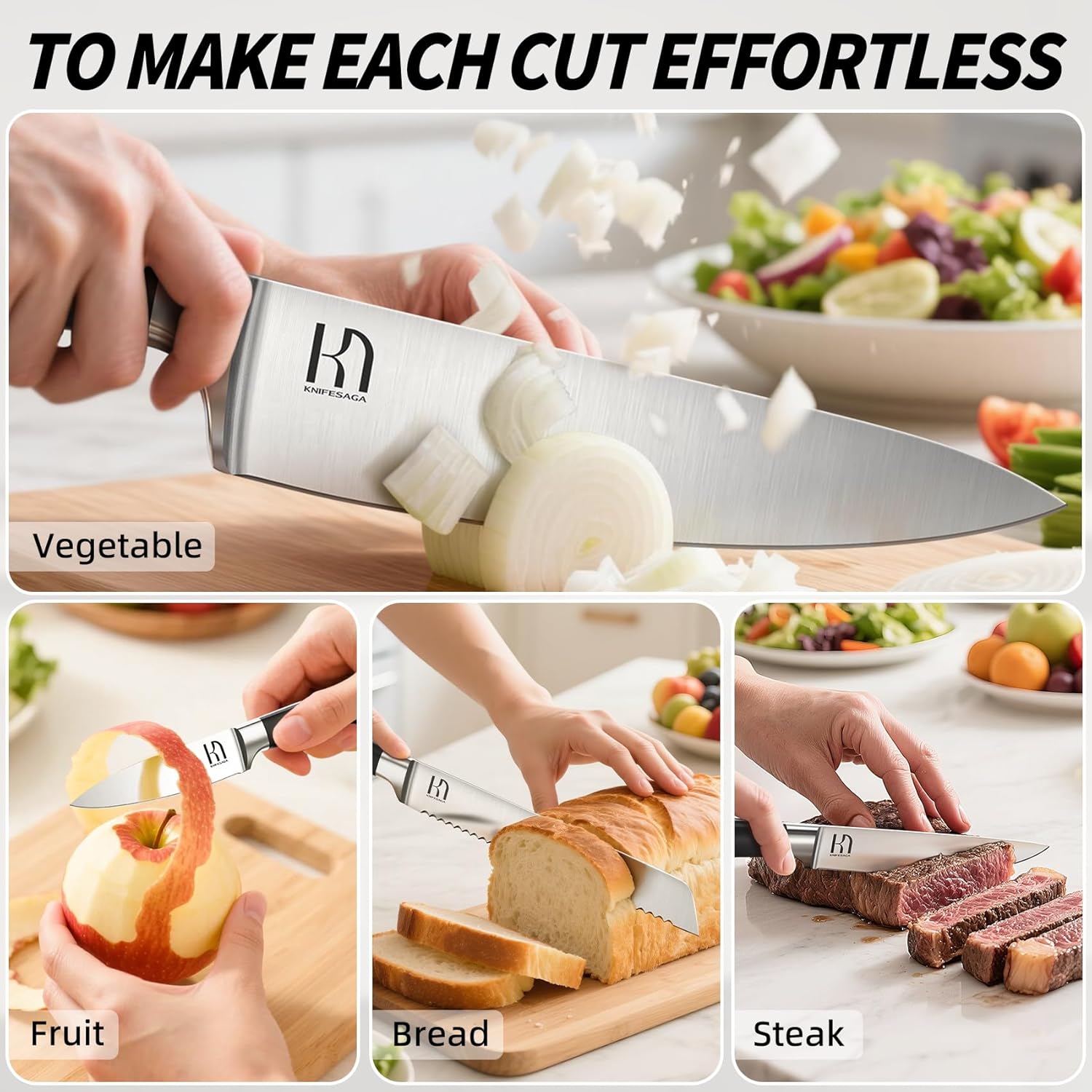 - 【Mystic Forged Steel】Experience the craftsmanship of KnifeSaga's advanced knife, featuring a revolutionary steel formulation. Through meticulous design, we have achieved an ultra-sharp 10° blade edge that guarantees swift and precise cutting, making every slice a breeze.