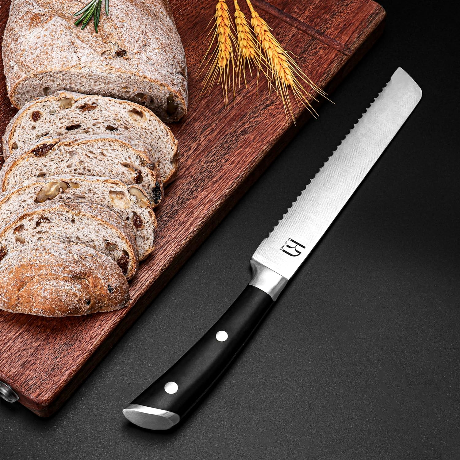 - 【15 Piece All-in-one Knife Set】Comes with 8" chef knife, 8" bread knife, 8" slicing knife, 7" santoku knife, 5" utility knife, 3.5" paring knife, 6pcs 4.5" steak knife set, multi-purpose shears, sharpening steel all housed in a solid acacia wood block with non-slip bottom. Recommend hand-washing only.