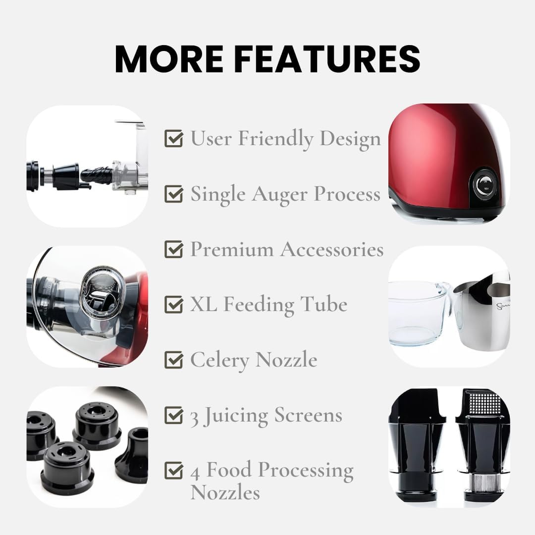 Cold Press SANA 707 Classic Horizontal Single Auger Slow/Low Speed Juicer | Easy Clean, Powerful Motor, Auto Feed, Compact, Celery Attachment, Frozen Desserts, Pasta Extrusion, 15 Year Warranty, Red