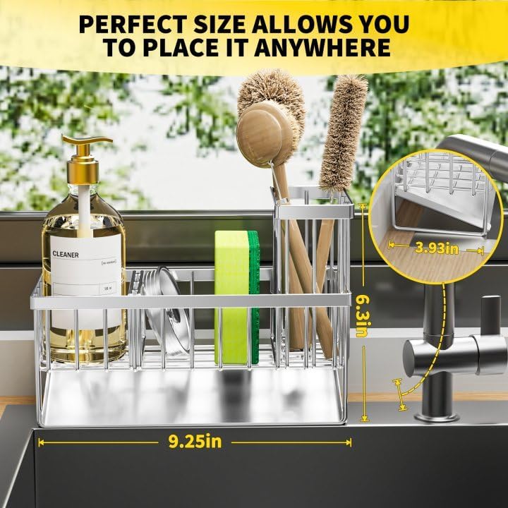- 【SMALL VOLUME】 Cisily sponge holder is suitable for kitchens with limited space. It measures only 9.25"*3.97"*6.37", Holds a detergent bottle, a sponge ball and sink stopper. With an extra upgraded brush holder that can hold up to 4 small and large sized brushes, with the Cisily Sink caddy you can save countertop space perfectly.