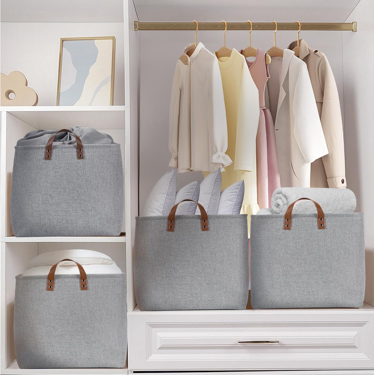 - 【Material】These storage baskets are constructed of wear resistant and attractive linen & EVA with linen interior lining. The sturdy PU handles make it easy to carry or pull off and out of shelves. DULLEMELO baskets for storage with a sturdy metal rod frame around the top to keep the storage bins shape.