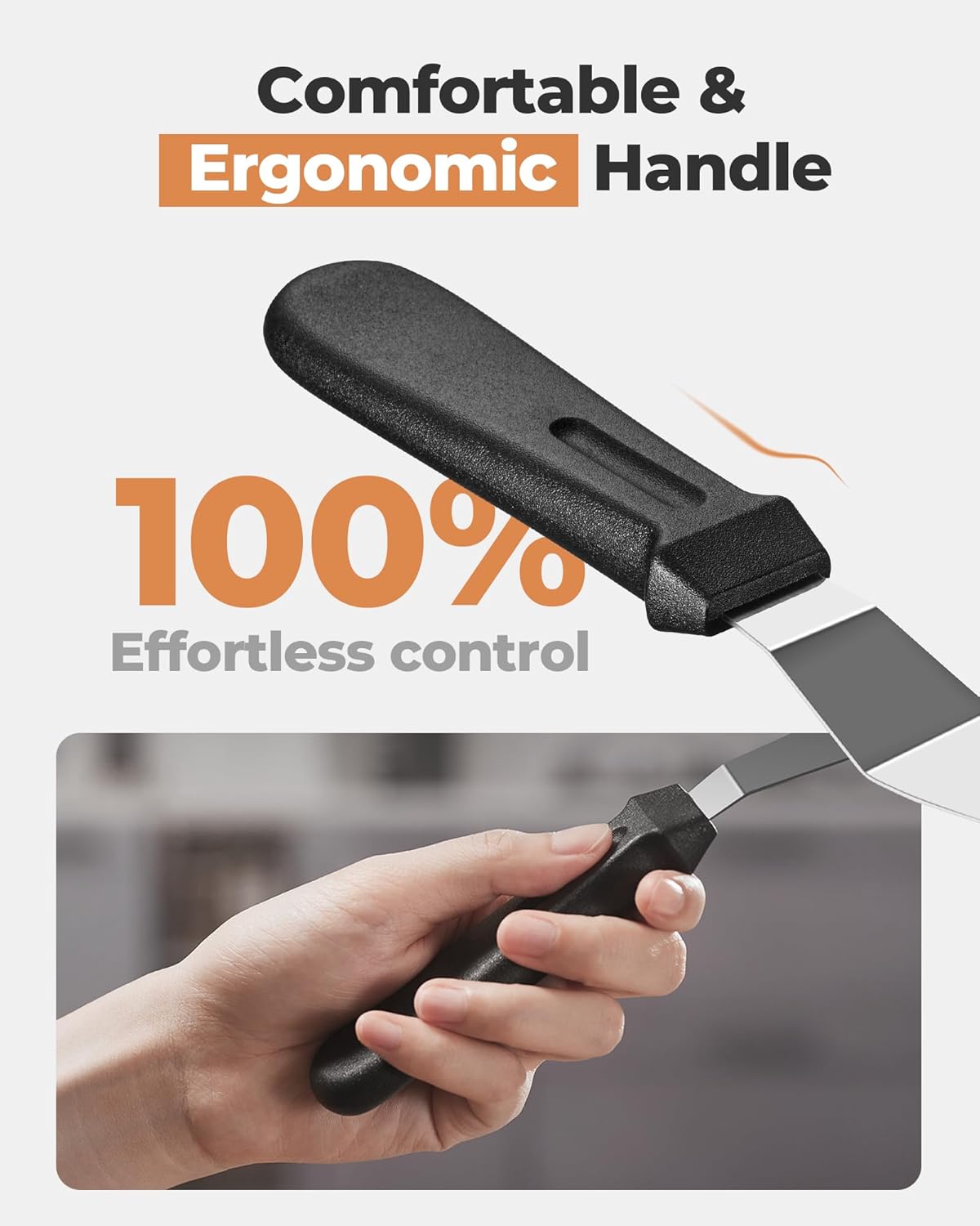 - Easy Reach: The offset design of an icing spatula, where the blade is set at an angle from the handle, offers excellent control and maneuverability. This design allows you to easily access hard-to-reach areas of your cake, including the sides and corners, while also reducing the risk of accidentally touching the cake surface with your hands or fingers.