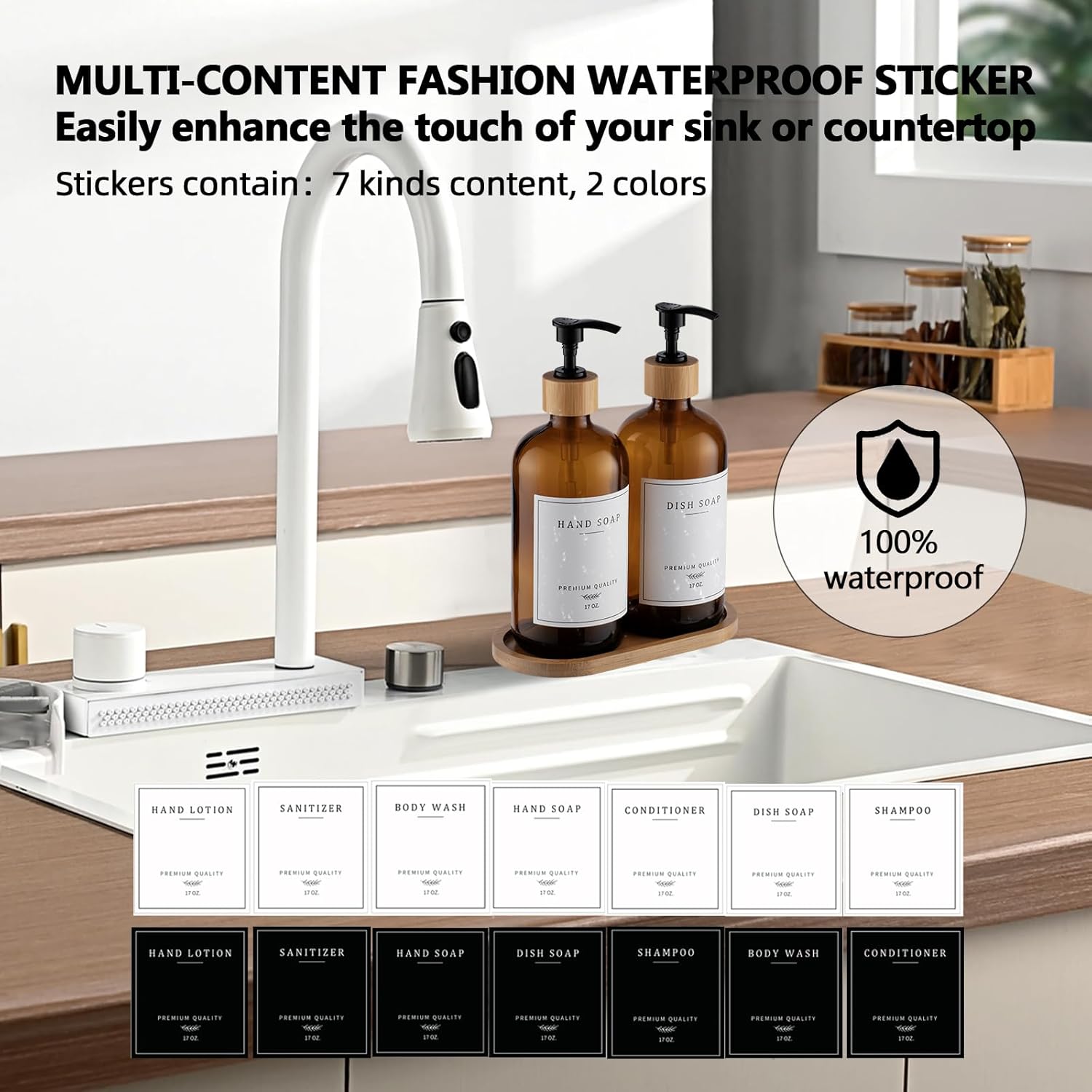- Elevating your kitchen and bathroom experience:This Soap Dispenser Kitchen with minimalist modern farmhouse chic style waterproof sticker,14pcs,pretty versatile customize the labels to your taste, can also change the labels out if you decide to change the look/colors match your decor. Waterproof material don't peel even when it gets wet and moist every day, perfect for the modern farmhouse vibe or really any kitchen decor.