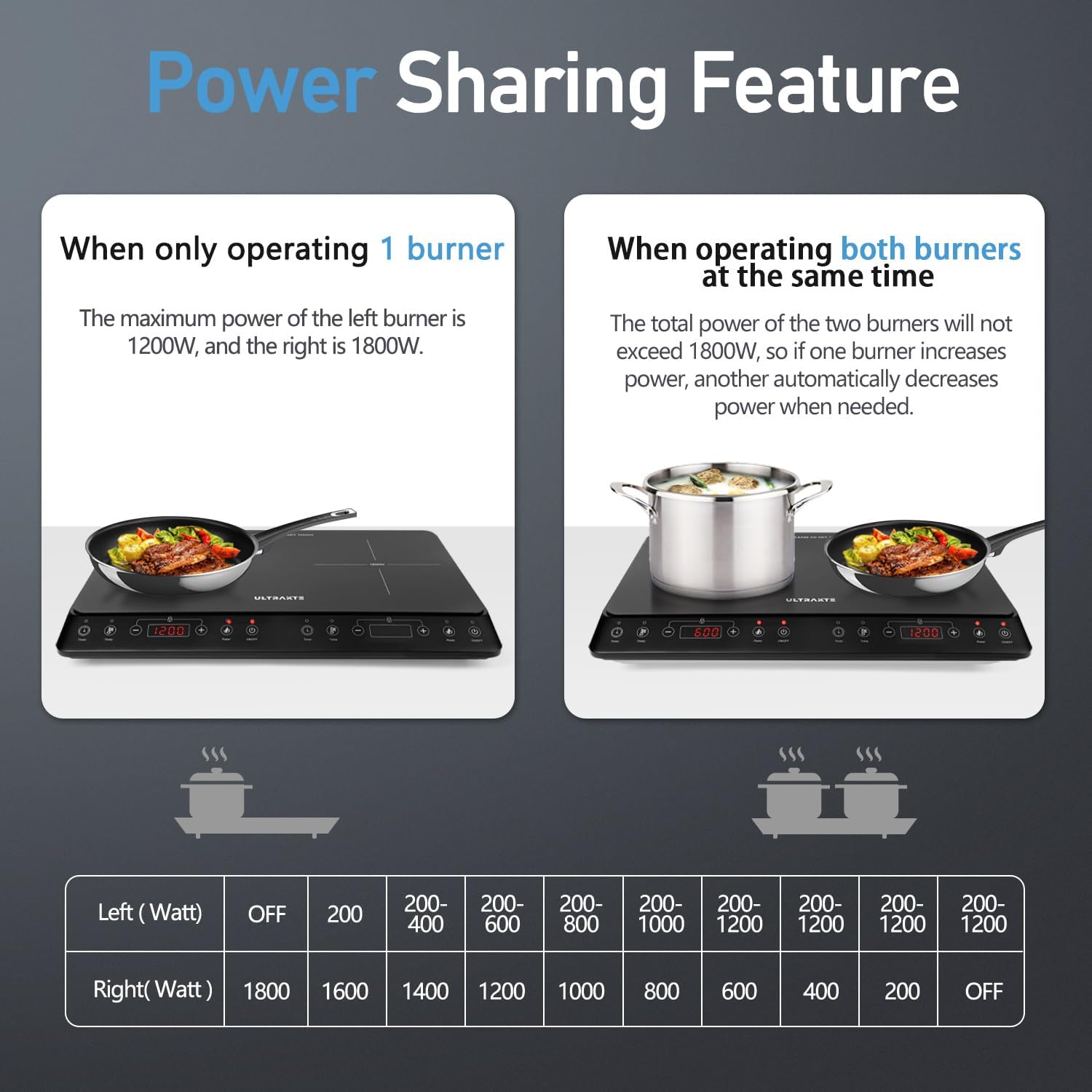 - 【Turns cooking into a breeze】This induction cooktop features two individually-controlled burners, with the left side offering 1200W and the right side 1800W. You can cook with both at once, like one for grilling and the other for stewing, making meal prep easier. Each burner can reach 1800W individually, but due to household circuit limits and for your safety, the combined power is capped at 1800W. The smart system automatically regulates power between the two burners to prevent overload and enhance efficiency.