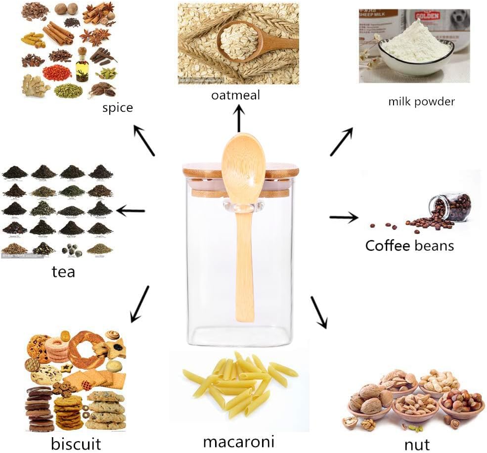 - [Highly Glass] The glass jars with bamboo lids and spoon are made of high-quality borosilicate glass and BPA free silicon which withstand temperature 0℉ to 400℉, you can put this airtight food canister in the pantry, kitchen corner or fridge.