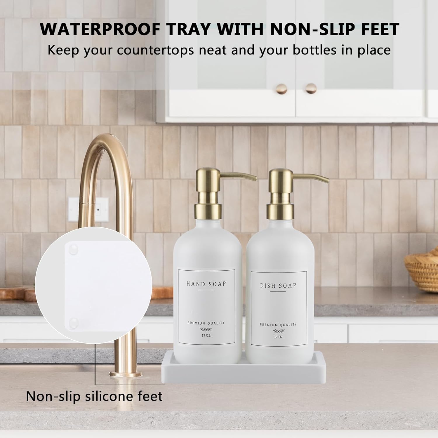 - MORE CLEAN AND ORGANIZED: This farmhouse style bathroom soap dispenser set is elegantly decorative and functional, keeps your kitchen or bathroom clean and classy, the white spill-proof tray with non-slip feet on the bottom is not like other wood that cracks easily, sturdy tray keeps your partner from moving the bottles all around the sink and doesn’t take up much room, make your kitchen area look more tidy and brings joy daily. Absolutely perfect for the modern farmhouse vibe or really any decor.