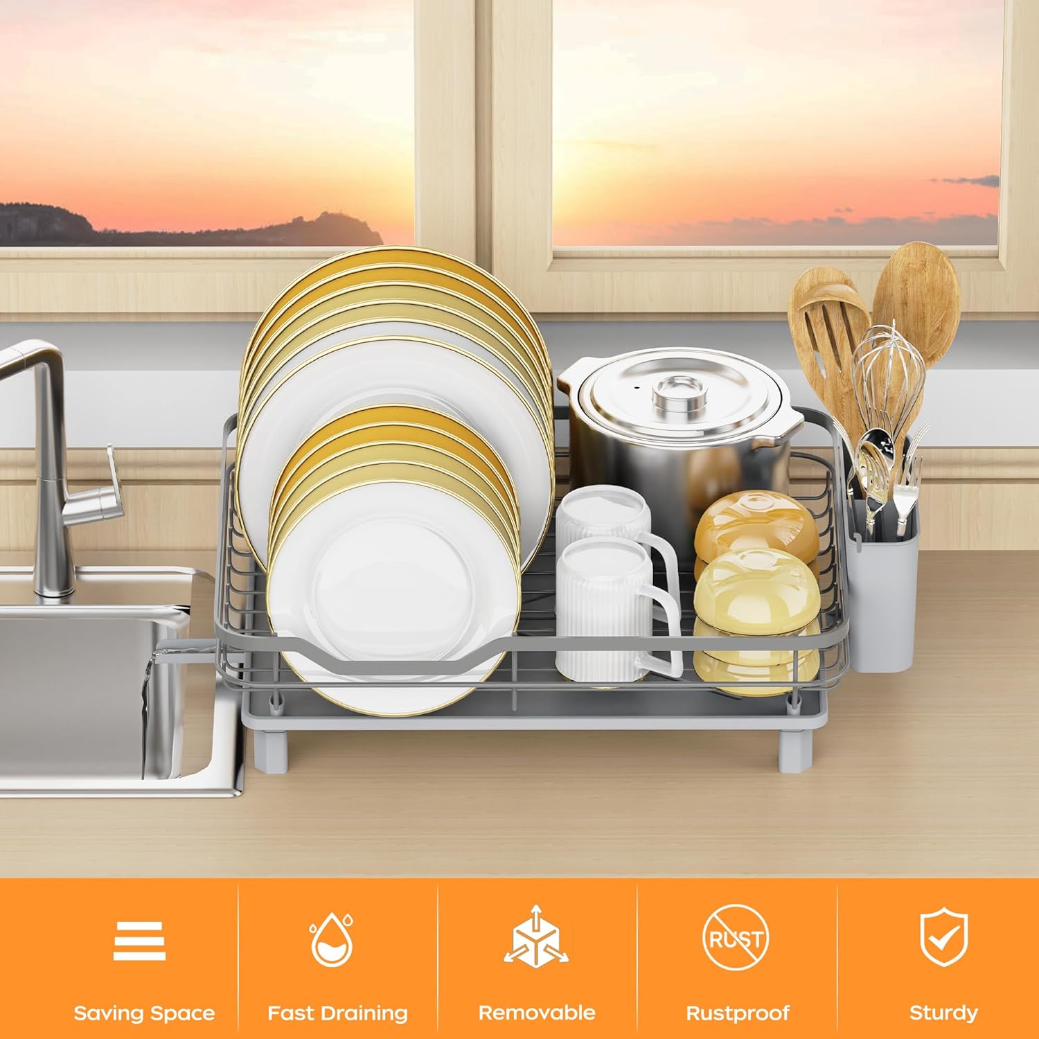 - Multi-angle placement & Easy to clean: The dish strainers for kitchen counter with a swivel drainage spout is perfect for directing draining the water into the sink to prevent pooling. This provides you with several placement options to best fit your sink and will help to keep the drying rack for kitchen counter dry and breathable. Also, the plate rack and utensil holder are removable, which makes the dish strainer easy to clean.