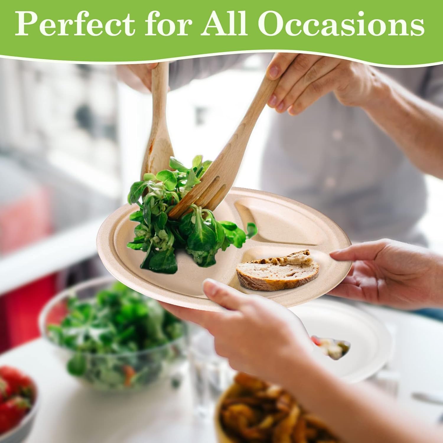 Compartment Plates - Disposable, 9 inch, 100 Pack, Biodegradable, Heavy Duty with Dividers