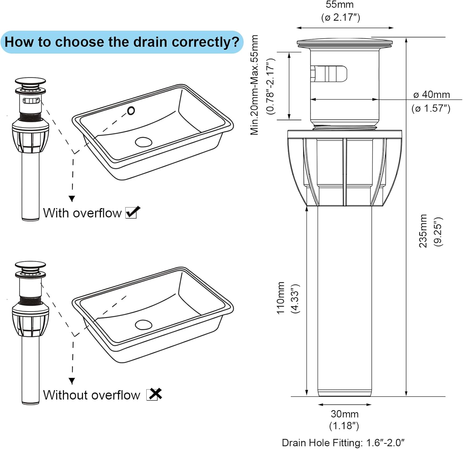 - ✓【FOR 1 3/4" DRAIN OPENING】Ideal for vessel sink or undermount sink with OVERFLOW. Suitable for sink holes from φ1.6 inches to φ2.0 inches (40mm-50mm). Be sure to measure your sink hole before making a purchase.