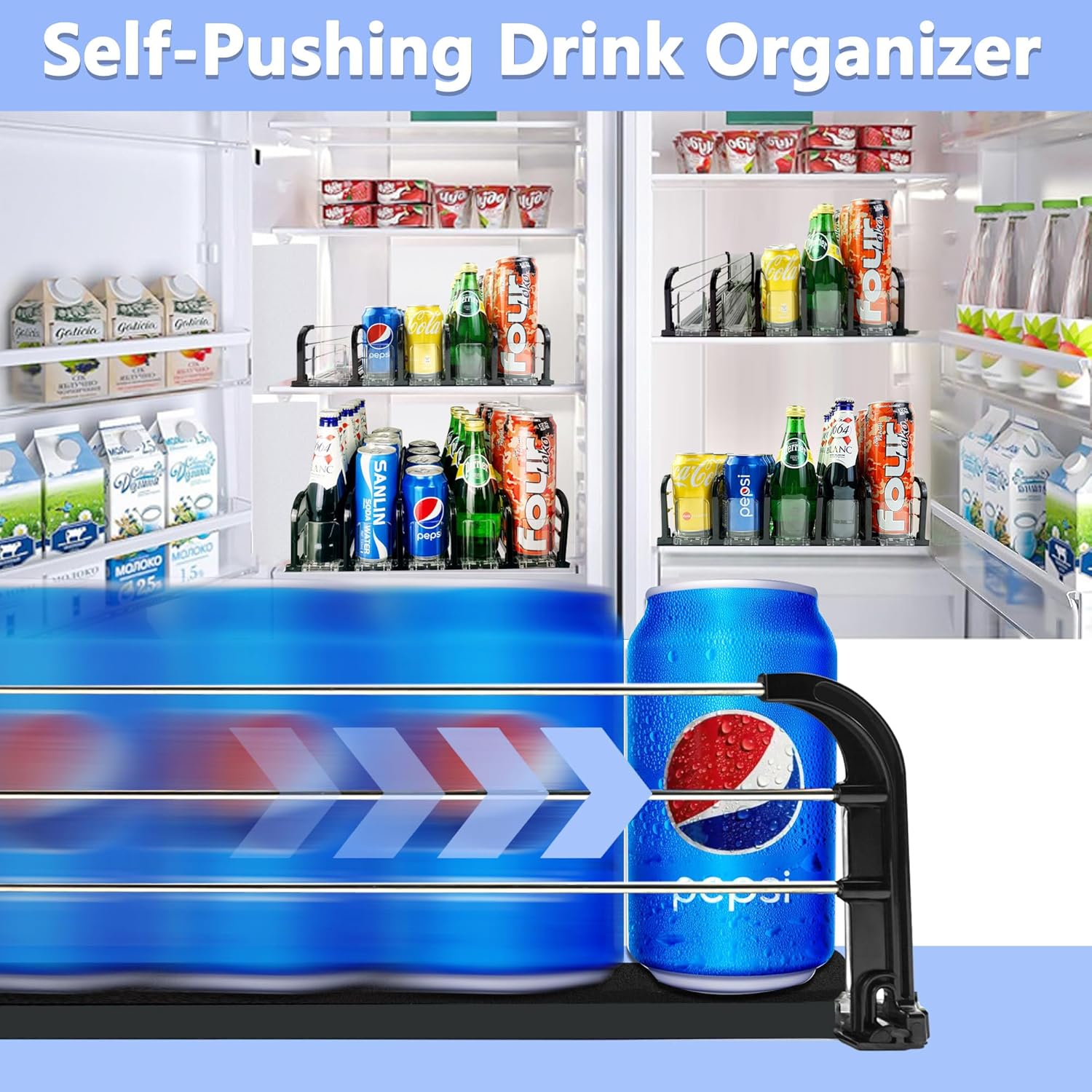 - Convenient life: Beverages will be automatically pushed forward when you take a drink out of the fridge drink organizer, the spring-loaded and self-propelled features can make it come true
