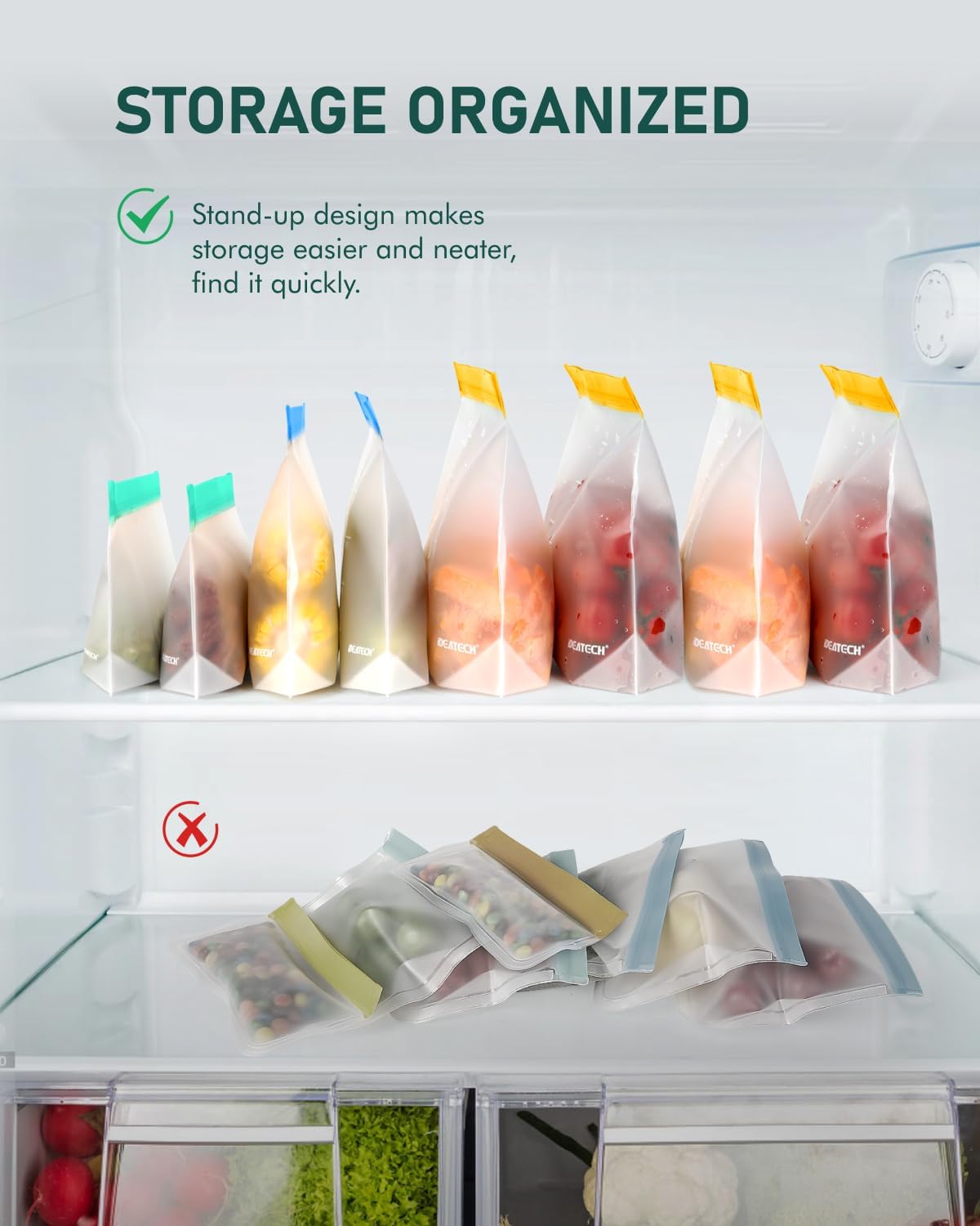 - Fridge Organizer, Large Capacity: Reusable storage bags can stand up in the fridge which will make your fridge organized and larger capacity than flat bags can storage meats, meal, vegetables, frozen foods, cereal, fruits