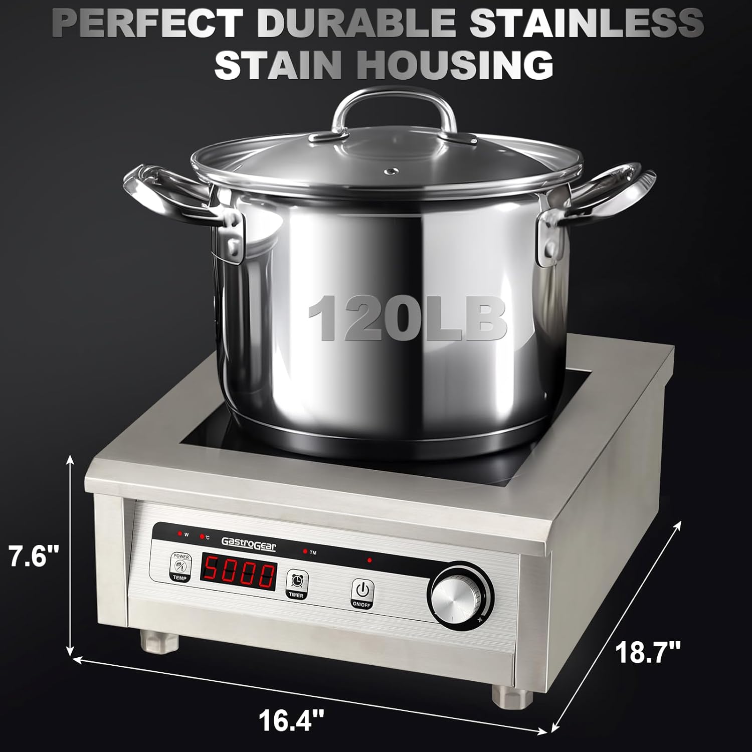 - High Performance: GastroGear's Commercial Induction Cooktop boasts a powerful 5000W/220V~240V capacity, featuring a 9.25-inch large double-layer coil, which has both a full power stage for fast heating and a low power stage for keeping warm. (Tips:It equippied with 9.25 inch double-layer coil, and the white circle on the top is just decorative, instead of a display of the coil's diameter)