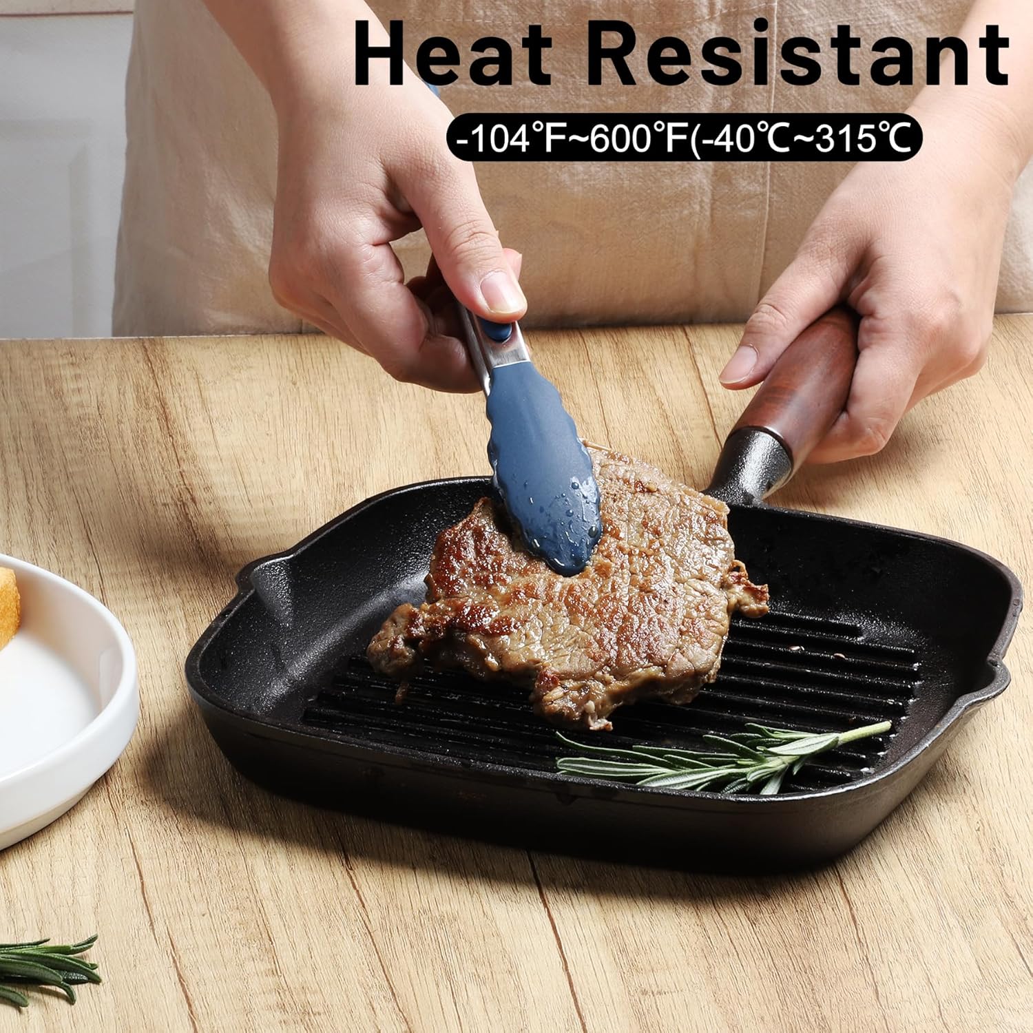 - EASY TO USE: The cooking tongs' handle is cushioned with silicon, good for thumb rest and ensures good grip and control. The Food Grade silicon tongs tip is heat resistance 600°F and less prone to scratch the pan. Easy to rinse, dishwasher safe.