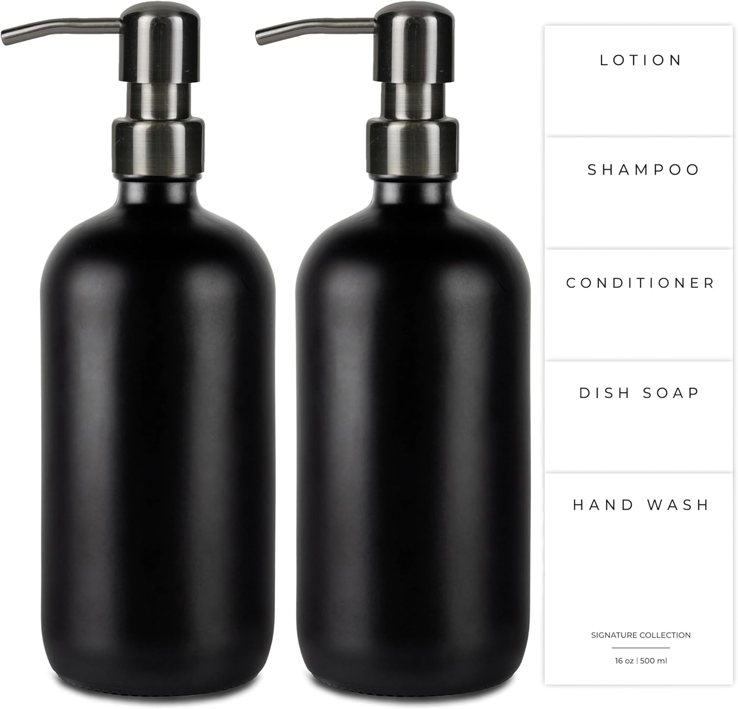 Emerson Essentials Glass Soap Bottle Dispensers, 2 Pack, Stainless-Steel Pumps Rust-Free, Hand Set for Bathroom Kitchen Sink, Liquid Lotion Shampoo Jars with 4 Waterproof Labels, 16 Oz Gunmetal