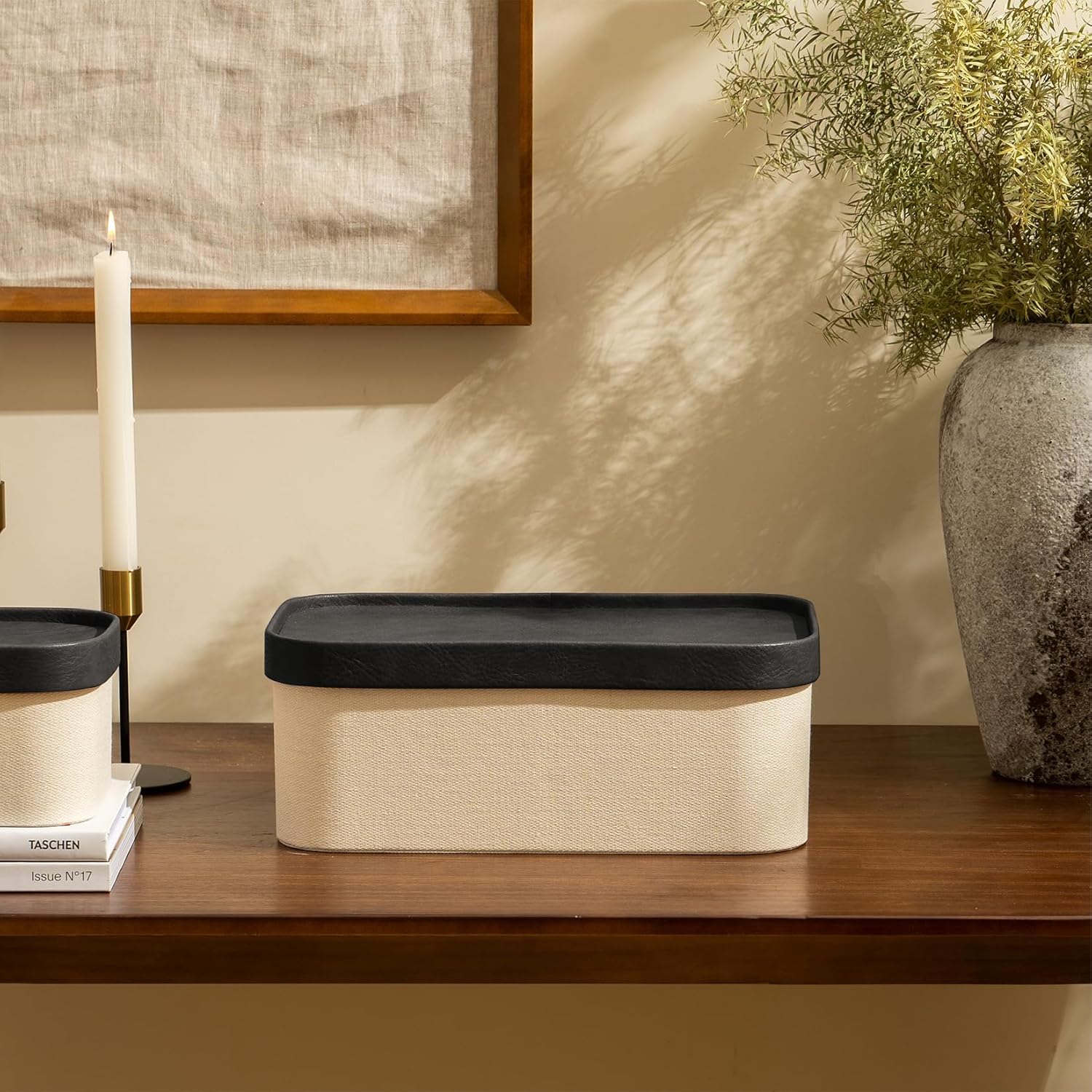 - CHIC and ECO-FRIENDLY STORAGE BOX SET - Made from sturdy MDF (Medium Density Fiberboard) and adorned with premium canvas, each box in this set is topped with a delicate vegan leather lid. These stylish storage containers effortlessly complement modern interior aesthetics. Plus, their construction from sustainable materials not only adds to their appeal but also makes a positive statement for your home and the environment.