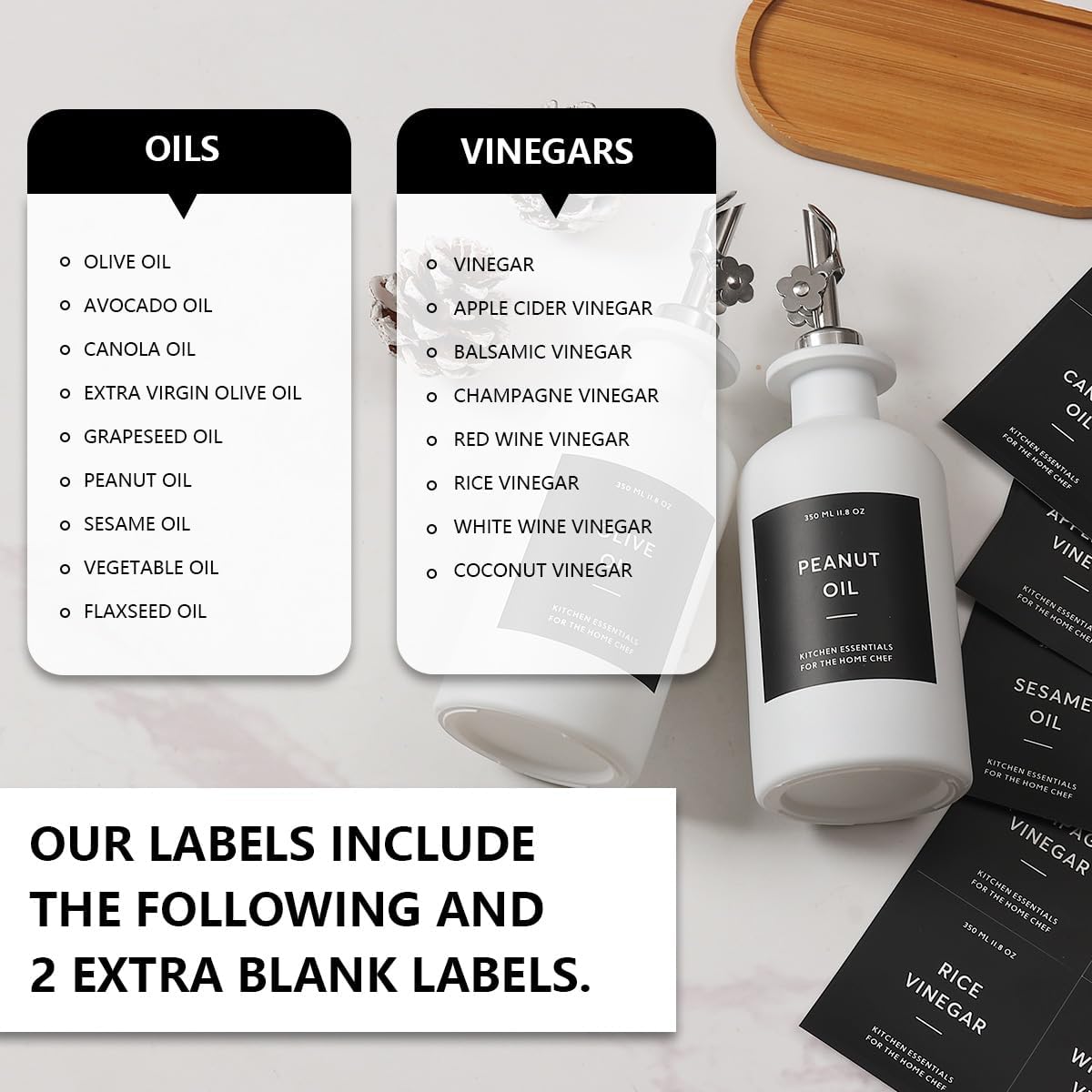 - KITCHEN ESSENTIAL - Worthy of sitting on your kitchen counter, The olive oil bottle dispenser for kitchen with label which can help you identify them easily, both decorative and practical, this oil dispenser bottles not only kitchen oil dispenser, but also black and white kitchen décor.