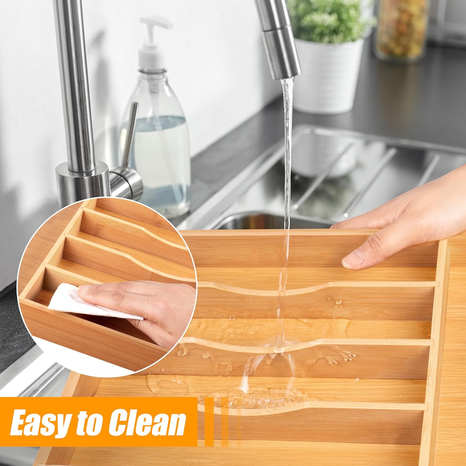 - ✅【Perfect premium bamboo】Our utensil silverware drawer organizer flatware cutlery tray is crafted from natural bamboo that has been grown for over 4 years. Each silverware drawer organizer made of bamboo is meticulously handcrafted by seasoned artisans to ensure a smooth, splinter-free surface. You can confidently allow your family or children to use our silverware drawer organizer. Unlike plastic and metal drawer organizers, our utensil holder is water-resistant and odor-resistant, making it perfect for long-term use.