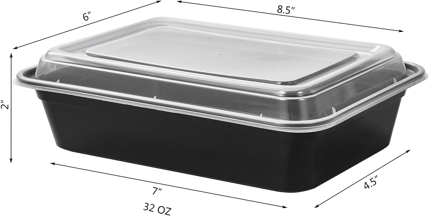 FULING 32 oz 150Pack Plastic Meal Prep Food Storage Containers with Lids Reusable 1 Compartment To Go Lunch Box Black Extra Large &Thick Microwave Freezer Dishwasher Safe BPA Free Stackable