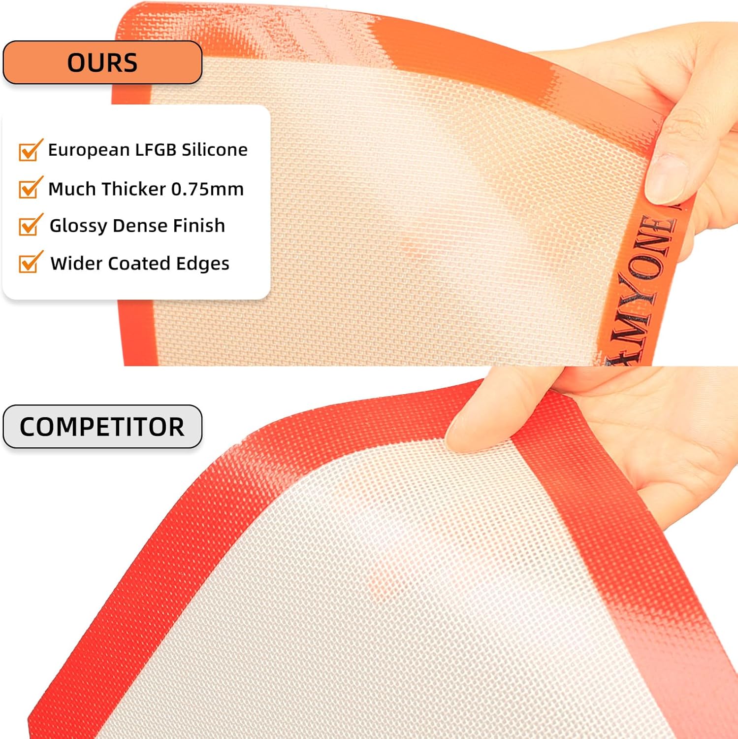 - 🧀【TOP-QUALITY CONSTRUCTION】Crafted from premium food-grade silicone and internally reinforced with fiberglass, this 2/3 silicone baking mat is built to last. It meets European standard, guaranteeing reliable performance for all your baking needs. With a thickness of 0.75mm and with glossy dense finish as well as wider coated edges, these baking mats for two thirds sheets, can withstand temperatures ranging from -40°F to 480°F making it suitable for a wide range of baking needs.