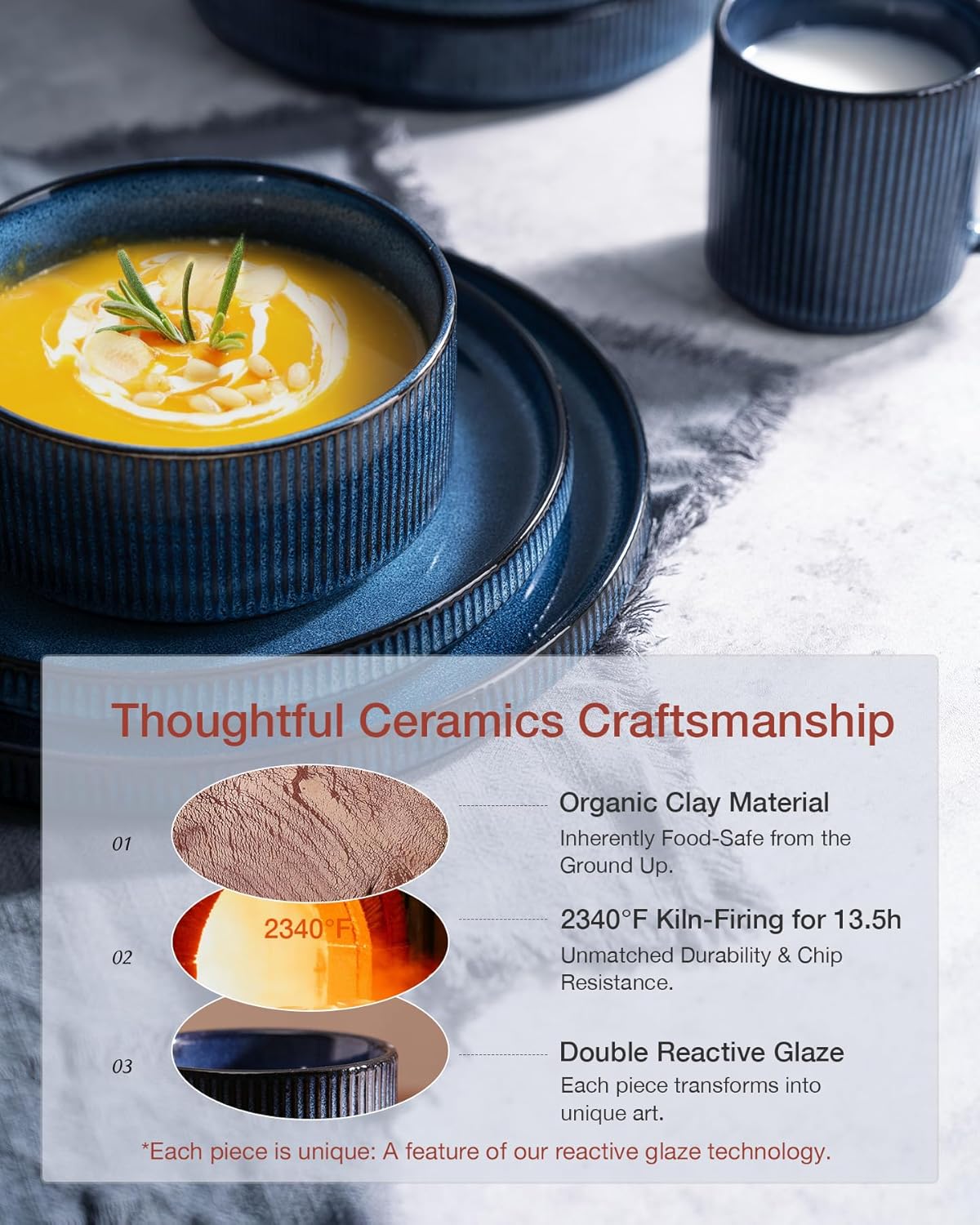 - [Premium Ceramic Durability]: Fired at 2340°F for 13.5 hours, our dishes boast impressive weight and thickness. They can resist chipping, scratching and daily wear, ensuring reliable kitchen use. Enjoy worry-free daily use, even with silverware