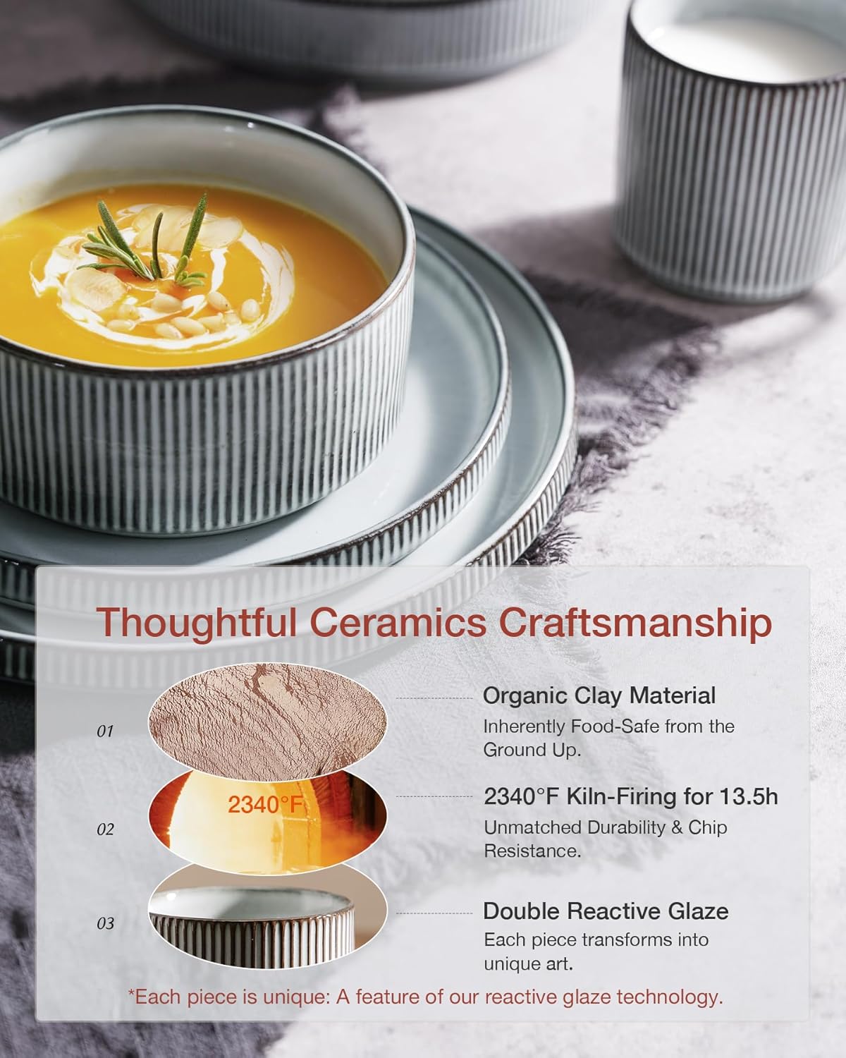 - [Stackable]: We are truly captivated by the design featuring vertical ribbed edges, but we also recognize the importance of optimal stacking. To address this, we have incorporated precision grooves at the base of this dish set, ensuring smooth and secure stacking