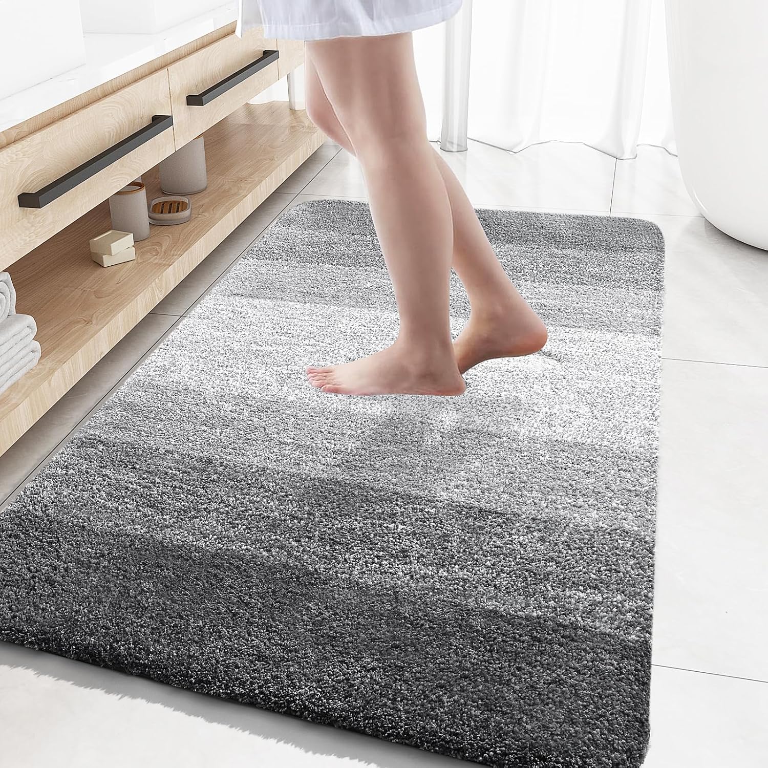 - [Ultra-Absorbent and Quick-Drying] Our bath mat features a soft shaggy microfiber fabric that absorbs water as you step out of the bath, shower, or while getting ready by the sink. The mat's deep pile efficiently traps moisture, allowing it to dry quickly and keep your rug clean and dry.
