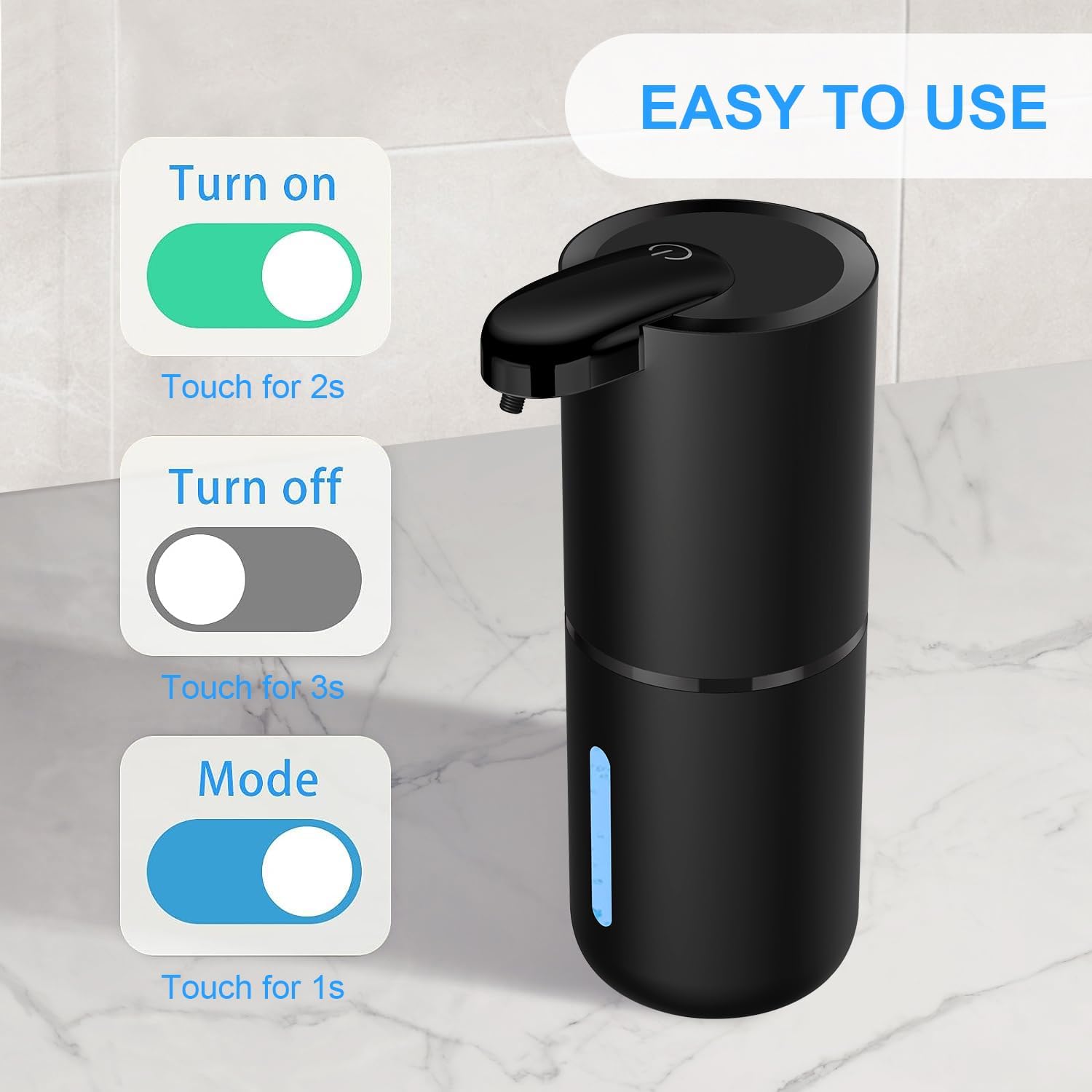 - 🌻 【4-Level Liquid Volume Adjustable】-- There are 4 different Liquid soap dispenser settings for options, only by touch the power button once to adjust the liquid volume ( And keep pressing the power button for 3seconds to turn on/off the dispenser ). The liquid volume weight is 0.5g / 1.5g / 2.4g / 3.2g (Base on each level of liquid soap volume setting) .