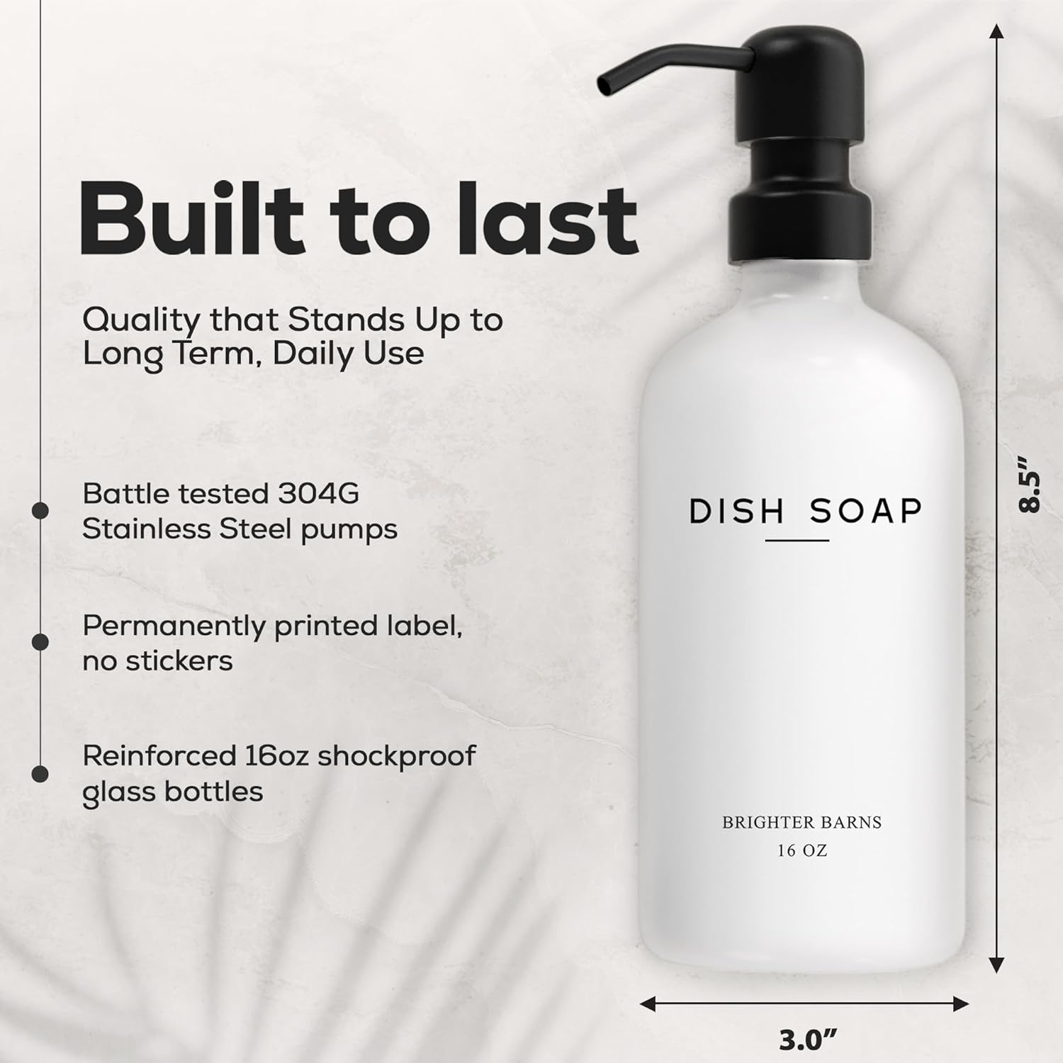 - AMERICAN DESIGN, UNCOMPROMISING QUALITY - Crafted with meticulous attention to detail, our glass soap dispenser set features 2 fortified 16oz glass bottles along with a set of corrosion-proof 304G stainless steel matte black pumps. All designed in the USA to provide unbeatable quality and enduring style that you can trust.