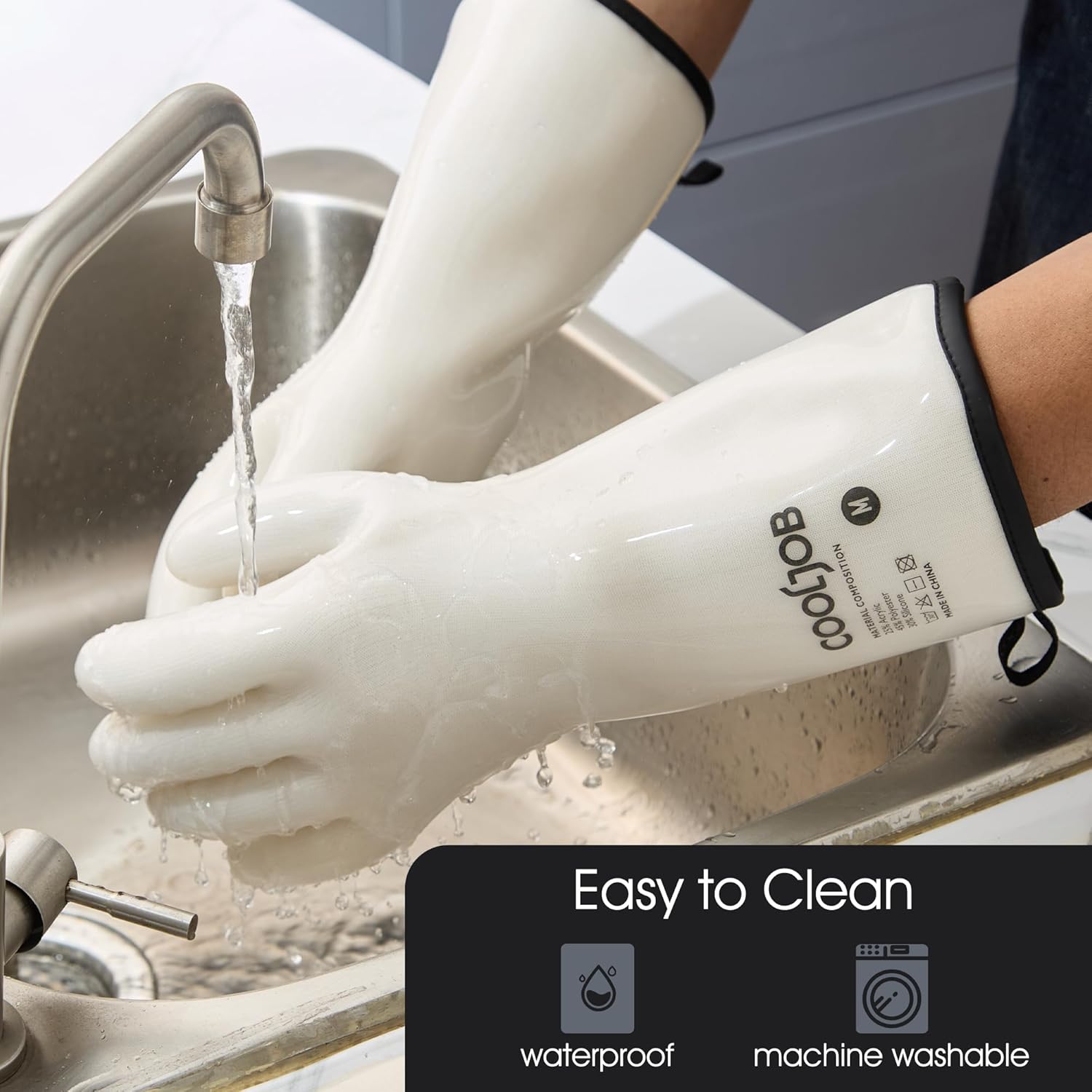 COOLJOB Heat Resistant Oven Gloves, Waterproof Liquid Silicone BBQ Grilling Gloves for Barbecue, Kitchen Cleaning, Baking, Food Contact, White, Medium