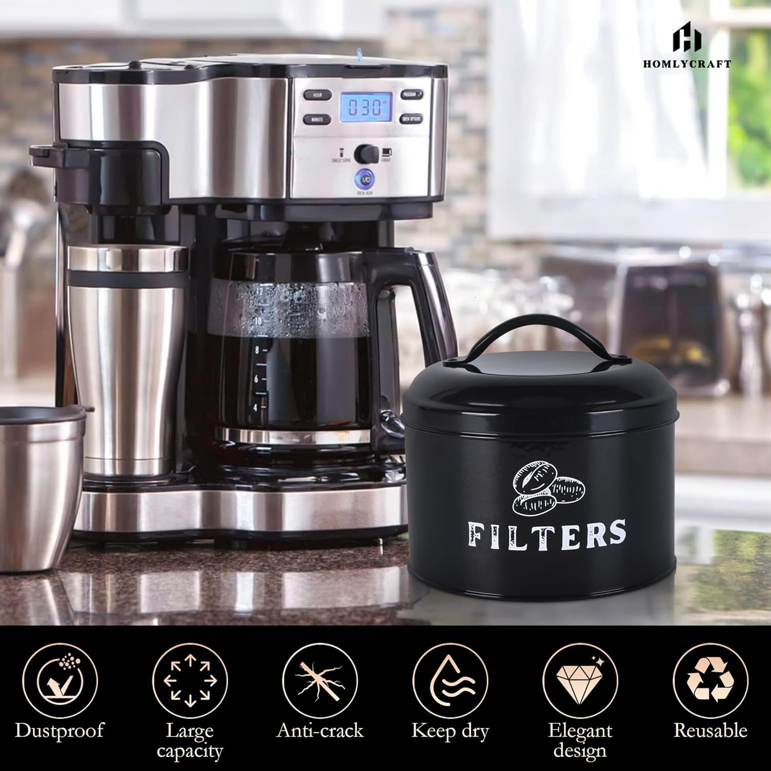 - Organize Your Coffee Filters: The coffee filter storage container has a durable, dustproof metal construction with lid and a spacious interior that allows you to store and protect coffee paper filters of all sizes and keep them at hand for easy preparation and pour-over.
