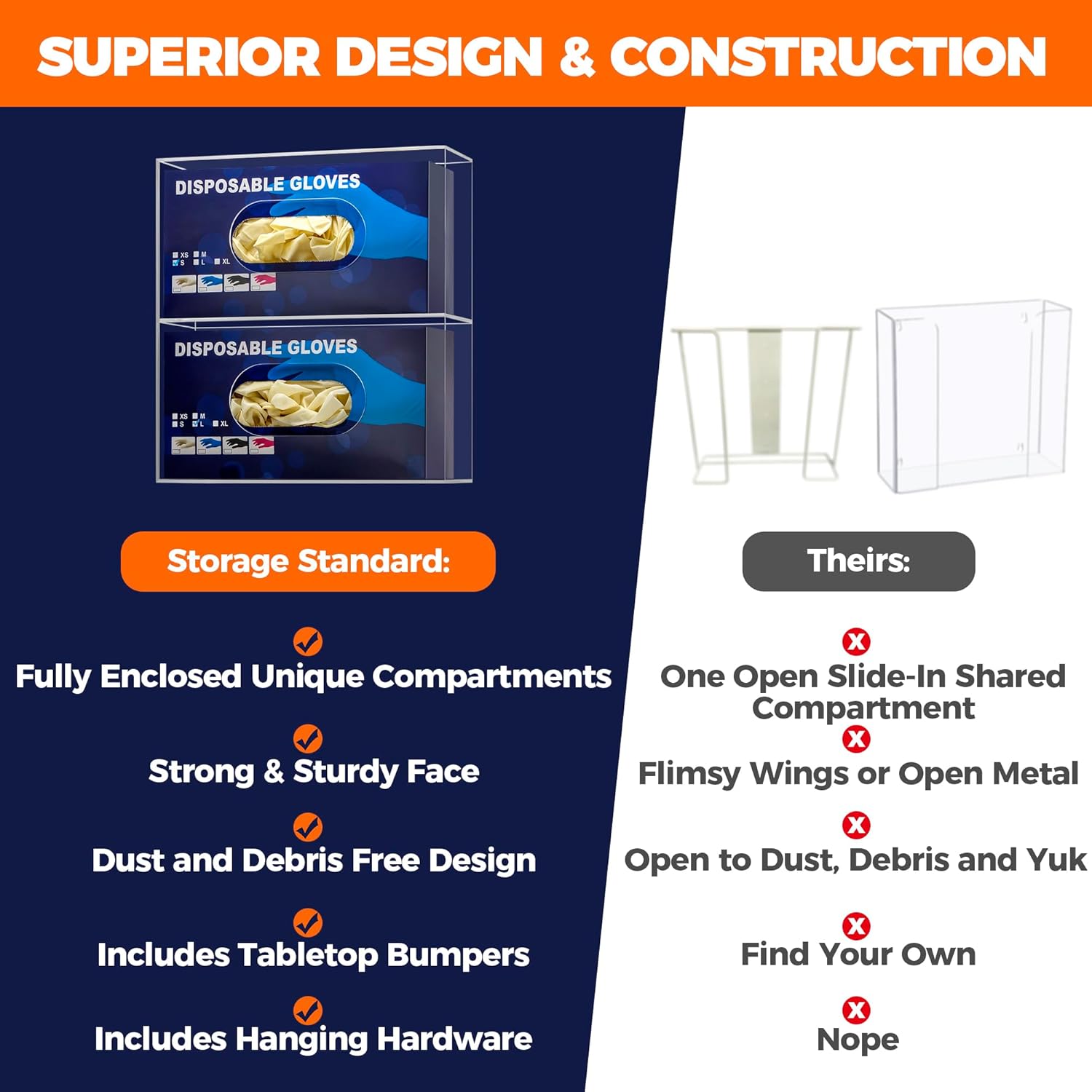 - Two Compartments for Various Gloves - Our disposable gloves dispenser has 2 separate compartments to let you store different sizes & types of gloves. Our latex glove dispenser wall mount rubber glove holder is sized to fit standard glove boxes.