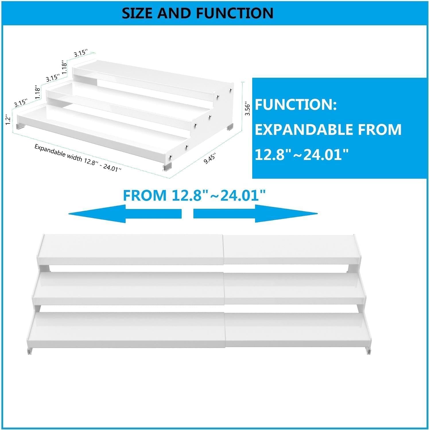 - ⭐[Expandable Size]The spice rack organizer is retractable and has a width range of12.8'' to 24.01'',you can put anywhere you need.Ideal for storing spice,condiment,pepper,sauces,seasoning,cosmetics,dressing,bottles,jars,cans,cup,more.