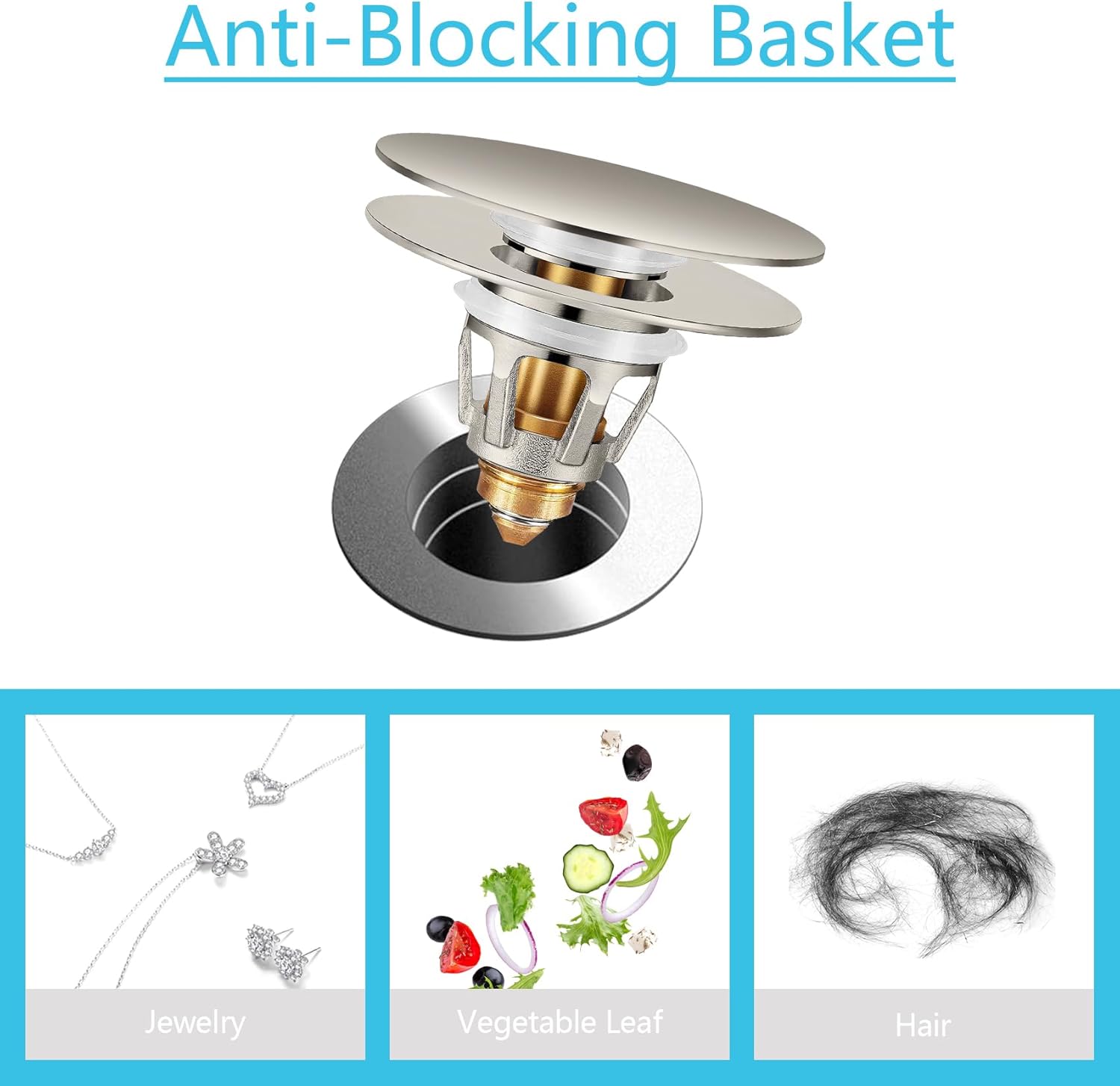 - [ with Hair Catcher ] The drain plug with an anti-blocking basket strainer inside which can collect hairs and prevent the drain from clogging up, achieving effective filtering, unlike regular push button drain. Suitable for bathtub, bathroom and kitchen sink, and so on.